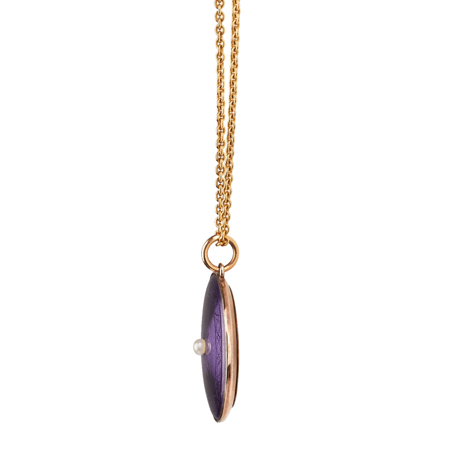 Elegant and beautiful locket in 15K (625) yellow gold and rose gold, enamel on a guilloche surface, set with a natural pearl, handmade