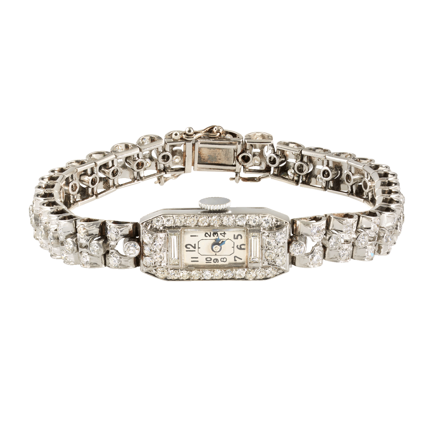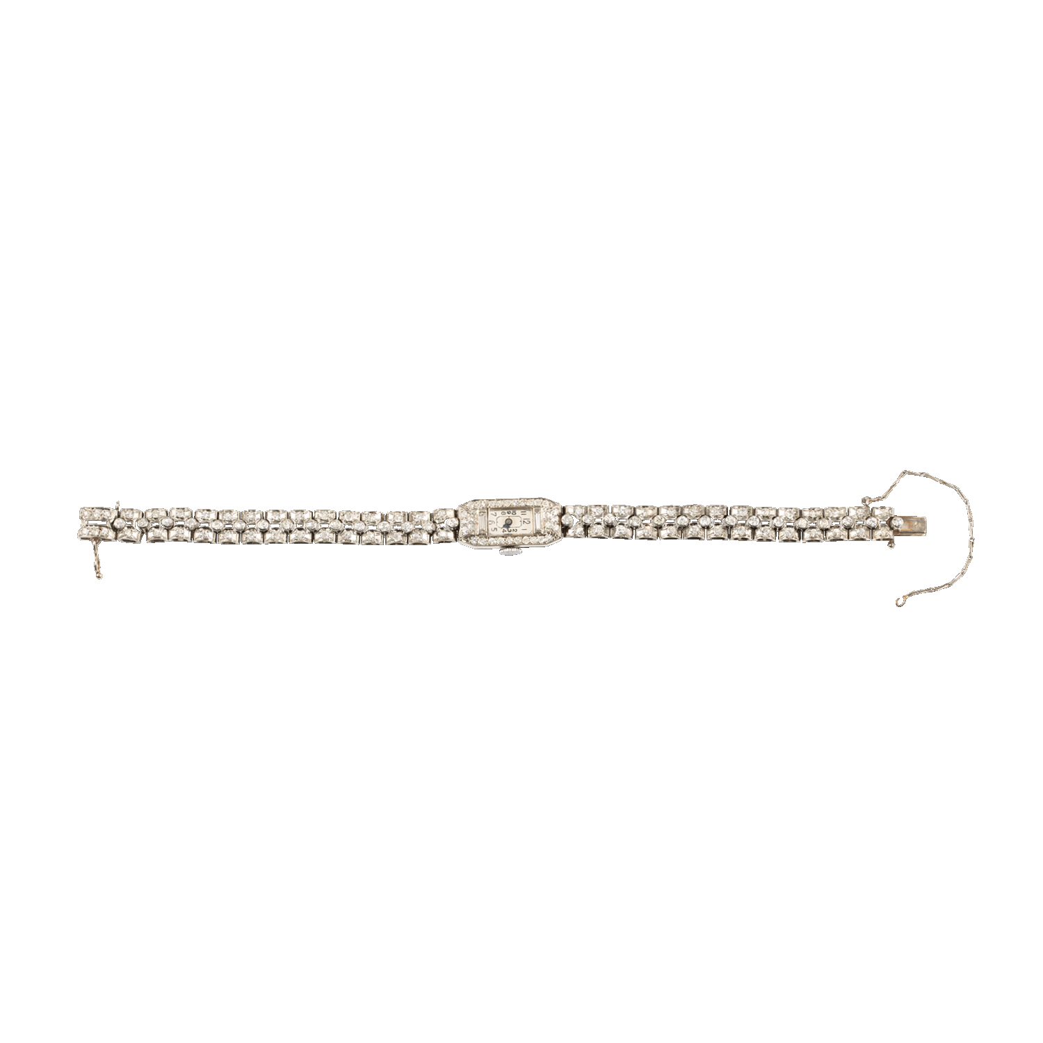 In platinum (900) and white gold, case set with 2 small baguette-cut diamonds and 30 small 8/8 diamonds, wesselton/si, on the bracelet, a small bezel with a diamond between each link; a total of 28 links, each set with 2 8/8 diamonds, wesselton/si, total diamond weight approx. 1 carat, box clasp with white gold snap closure and safety chain, printed brass dial, manufacturer: FHF, caliber 59, manual-winding movement, serviced in 2021, handmade