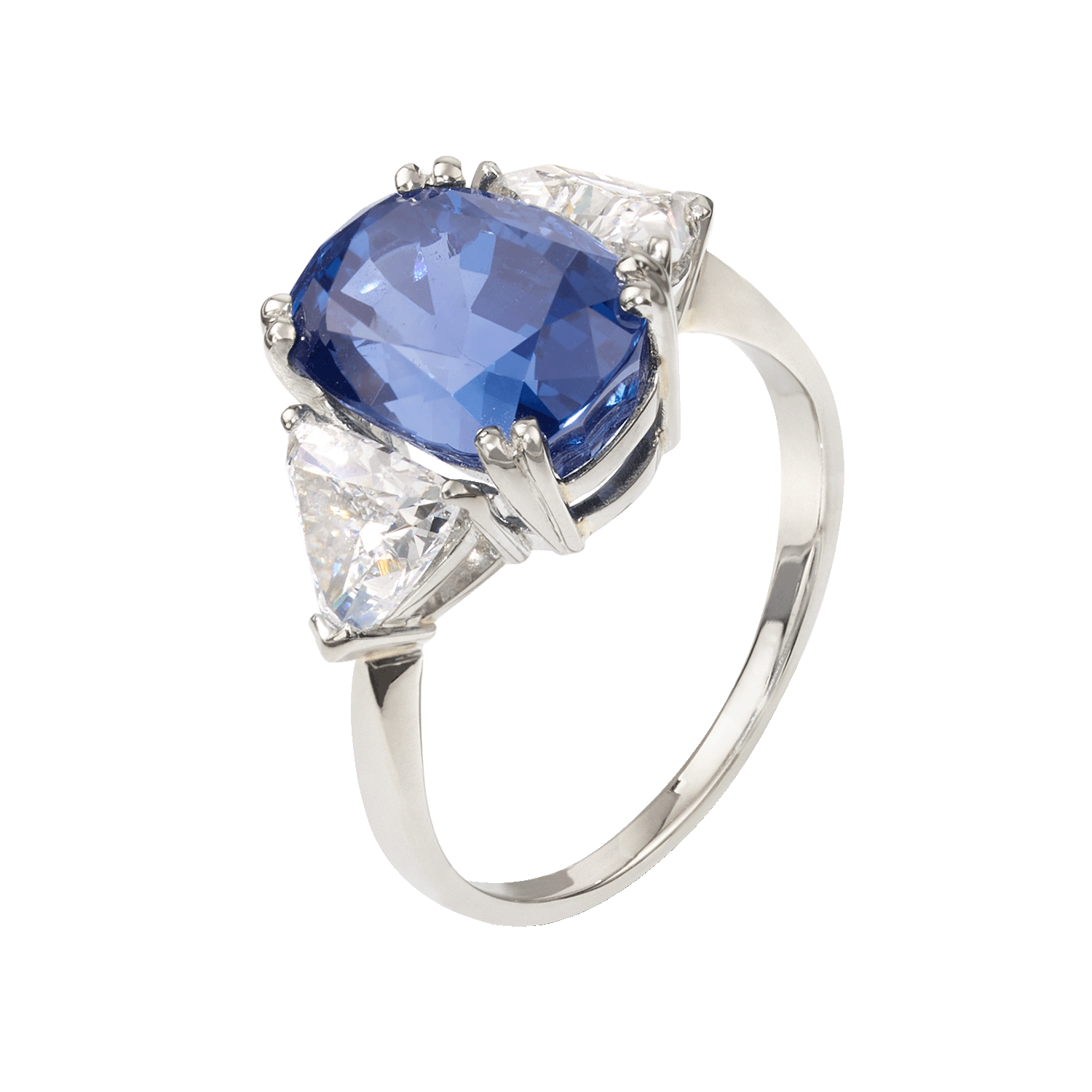 Classic, finely crafted sapphire ring in 18K white gold (750) by Gübelin, centered with a blue, oval sapphire weighing approx. 7.6 carats, 10.84 x 8.44 x 7.80 mm, Sri Lanka, unheated, flanked on each side by a fine triangular diamond, totalling approximately 1.2 carats, top wesselton vs, exquisite high-quality jewellery craftsmanship