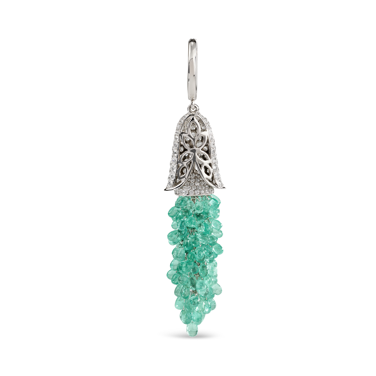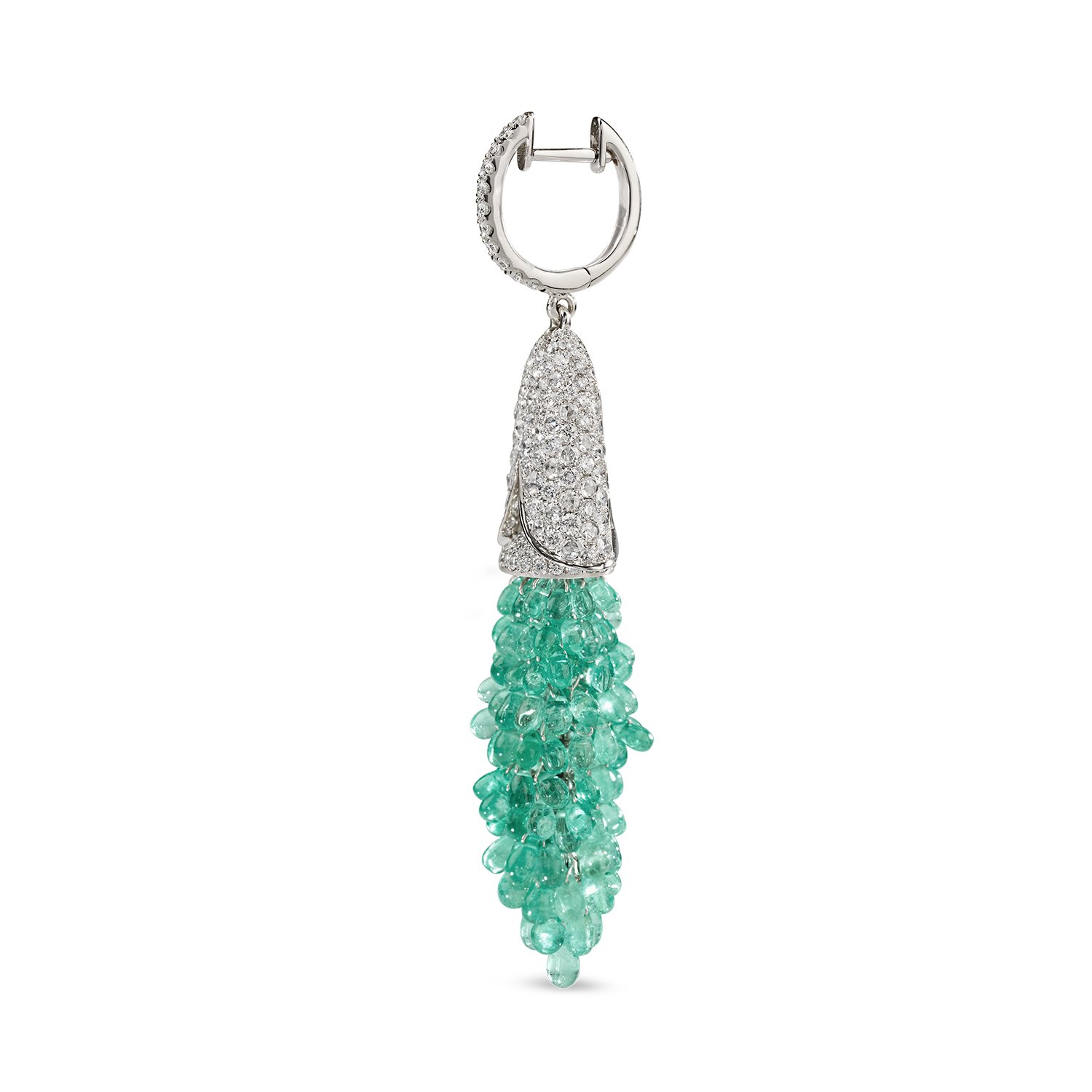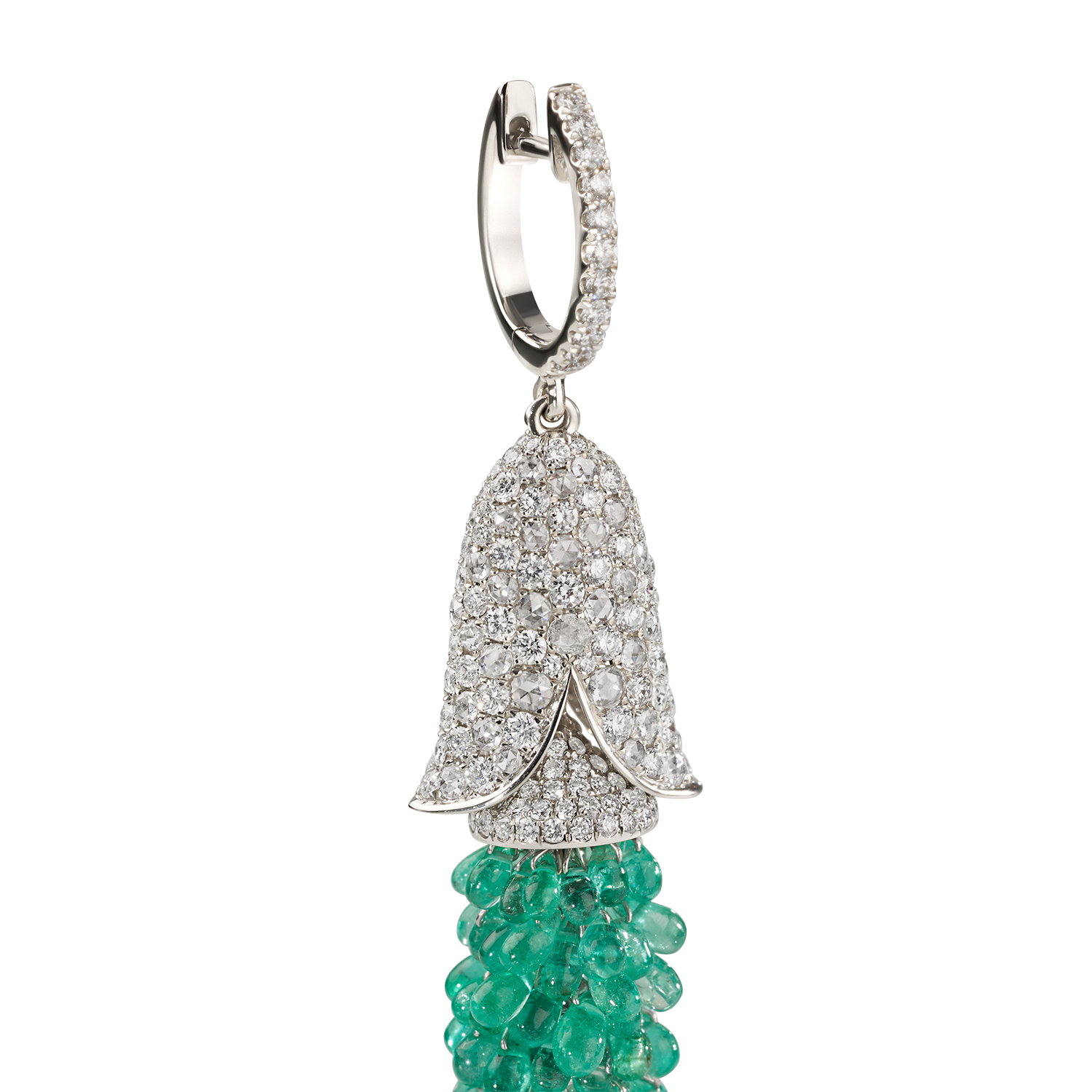 in 18K (750) white gold, elegant, casual loop earrings with moveable bellflowers set with round brilliant diamonds and rose-cut diamonds, total carat weight circa 3.1, tassel of pear-cut emeralds, total carat weight circa 23.0, very fine craftsmanship