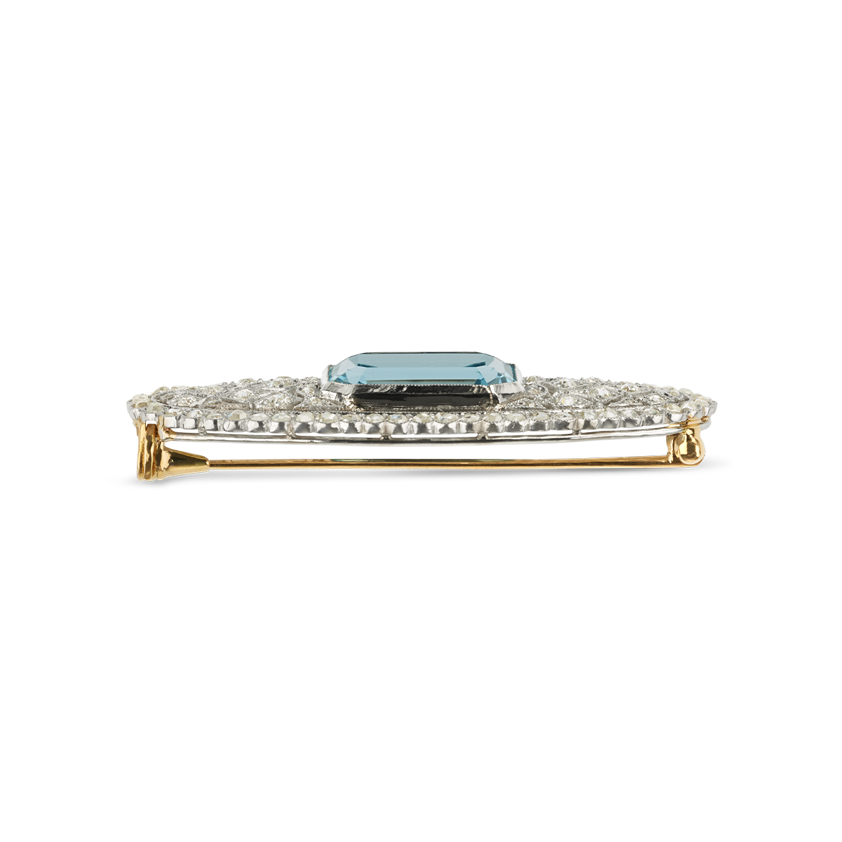 Decorative, intricately worked brooch in 950 platinum and 18K (750) yellow gold, center set with a beautiful octagonal aquamarine weighing approximately 9.19 carats, 15.6 x 12.2 x 6.3mm, natural beryl, pastel blue, surrounded by numerous old-cut and rose-cut diamonds, border adorned with rose-cut diamonds, brooch pin in yellow gold, very fine, high-quality craftsmanship