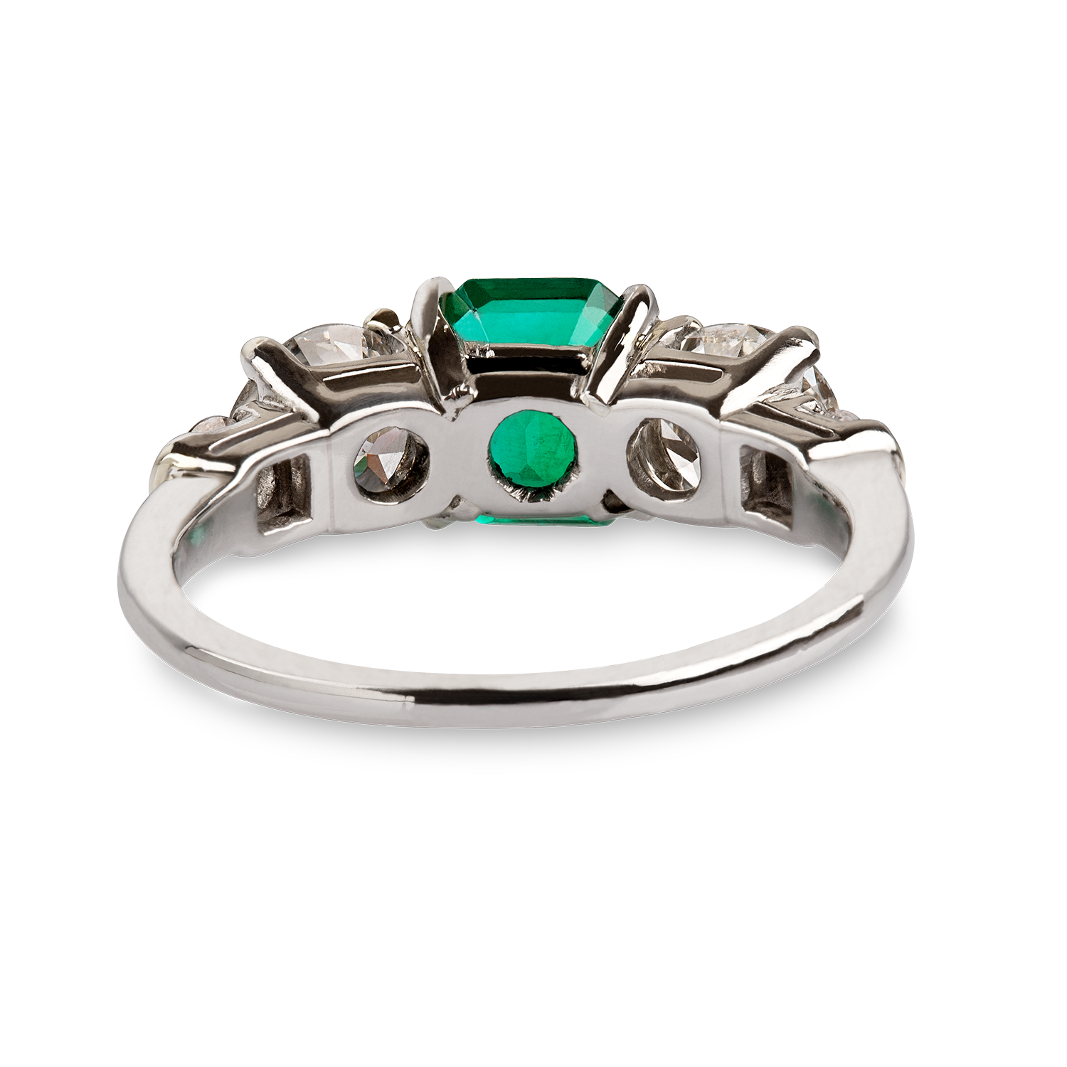 Elegant, fine emerald and diamond ring in platinum 900/1000 und 10% iridium, centre set with an octagonal Colombian emerald weighing circa 1.25 carats, minor oil, 2 brilliant-cut diamonds on each side weighing circa 0.55 carats, 2 smaller diamonds weighing a total of circa 0.2 carats G vs2-si1, total diamond weight circa 1.3 carats, polished finish, handmade