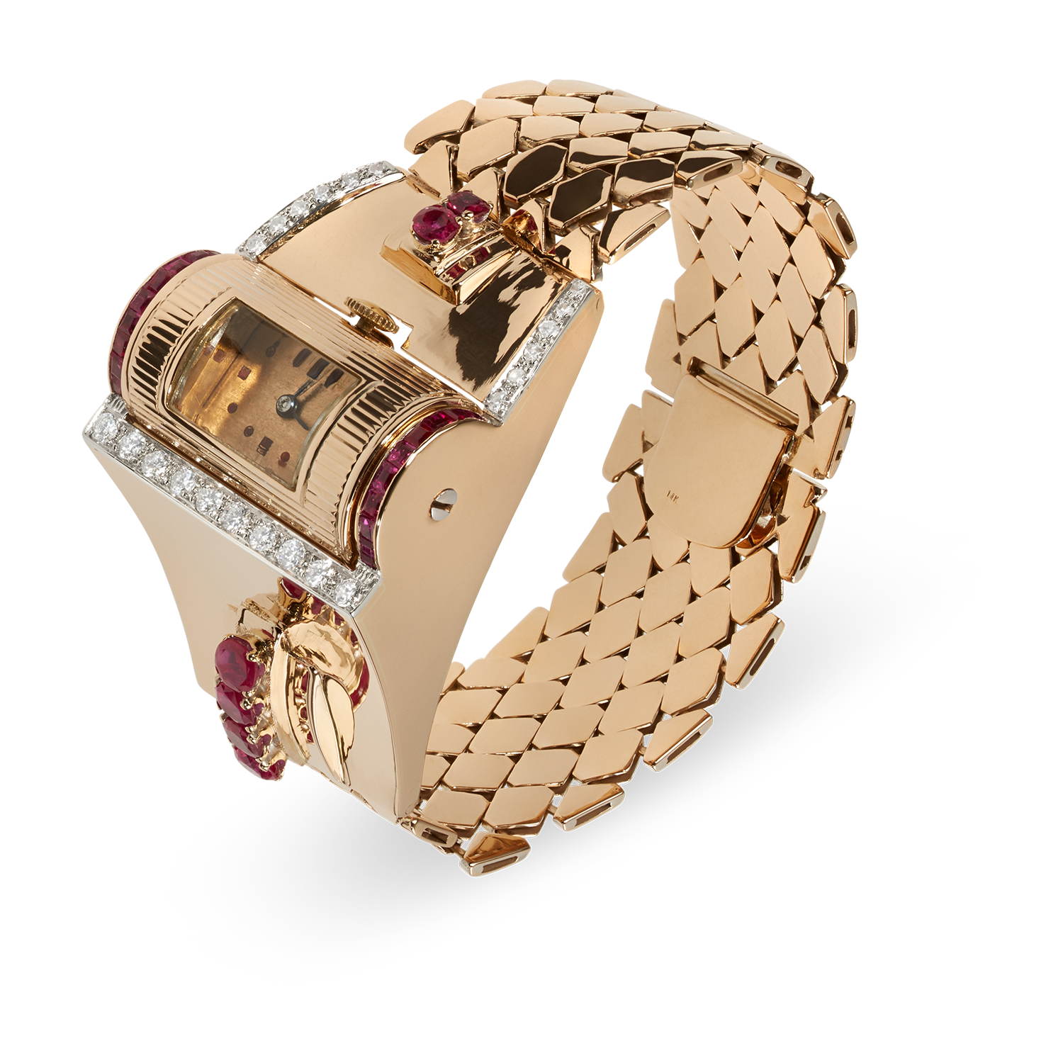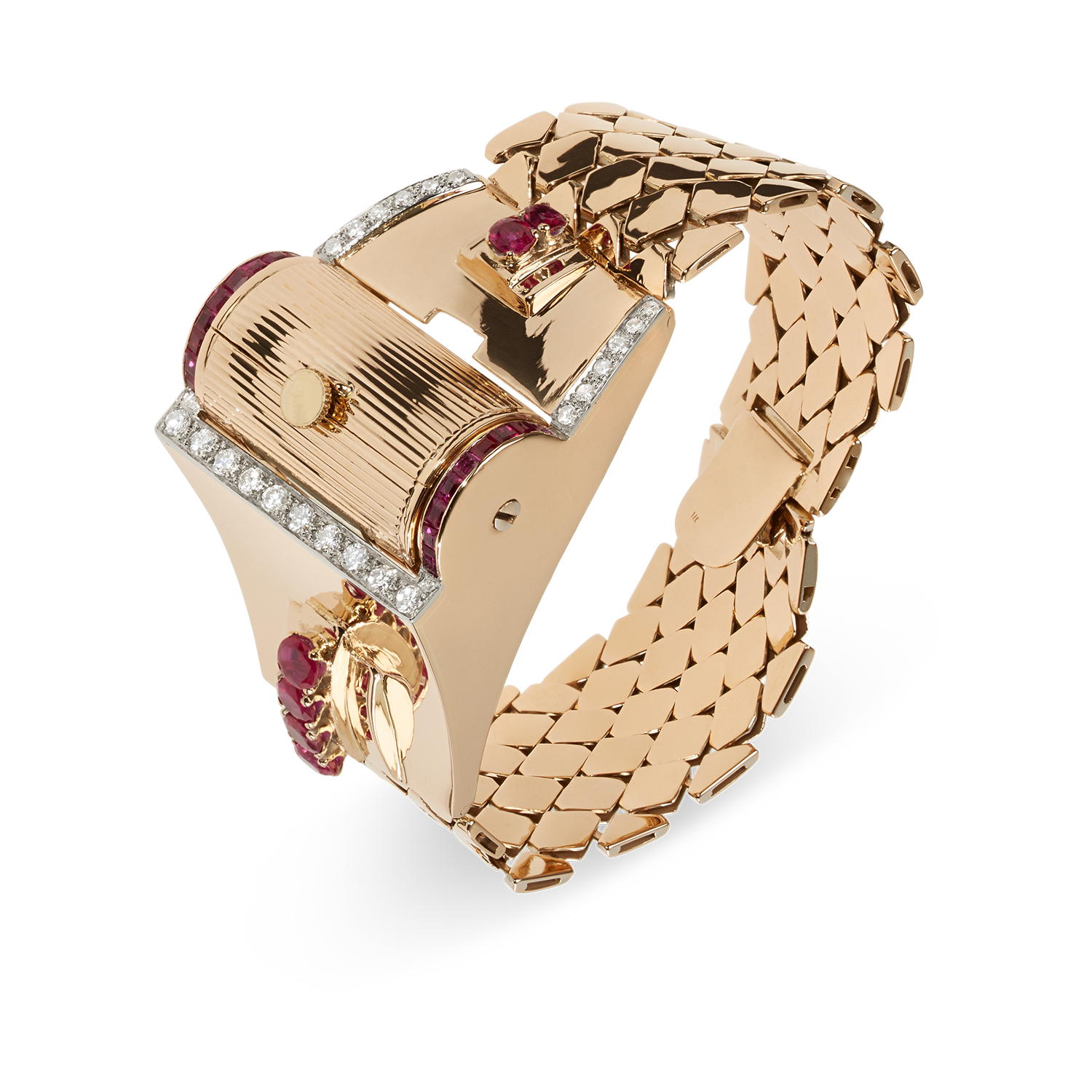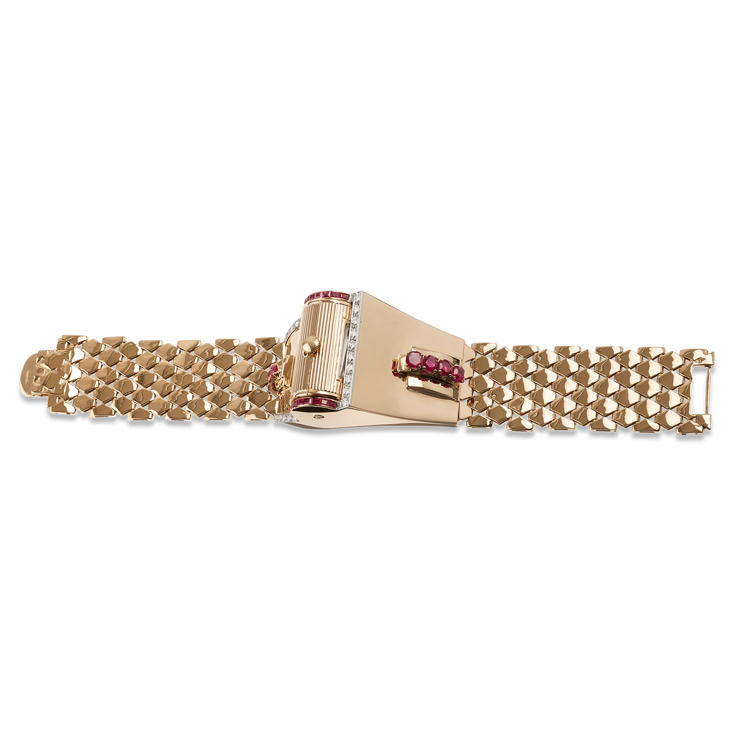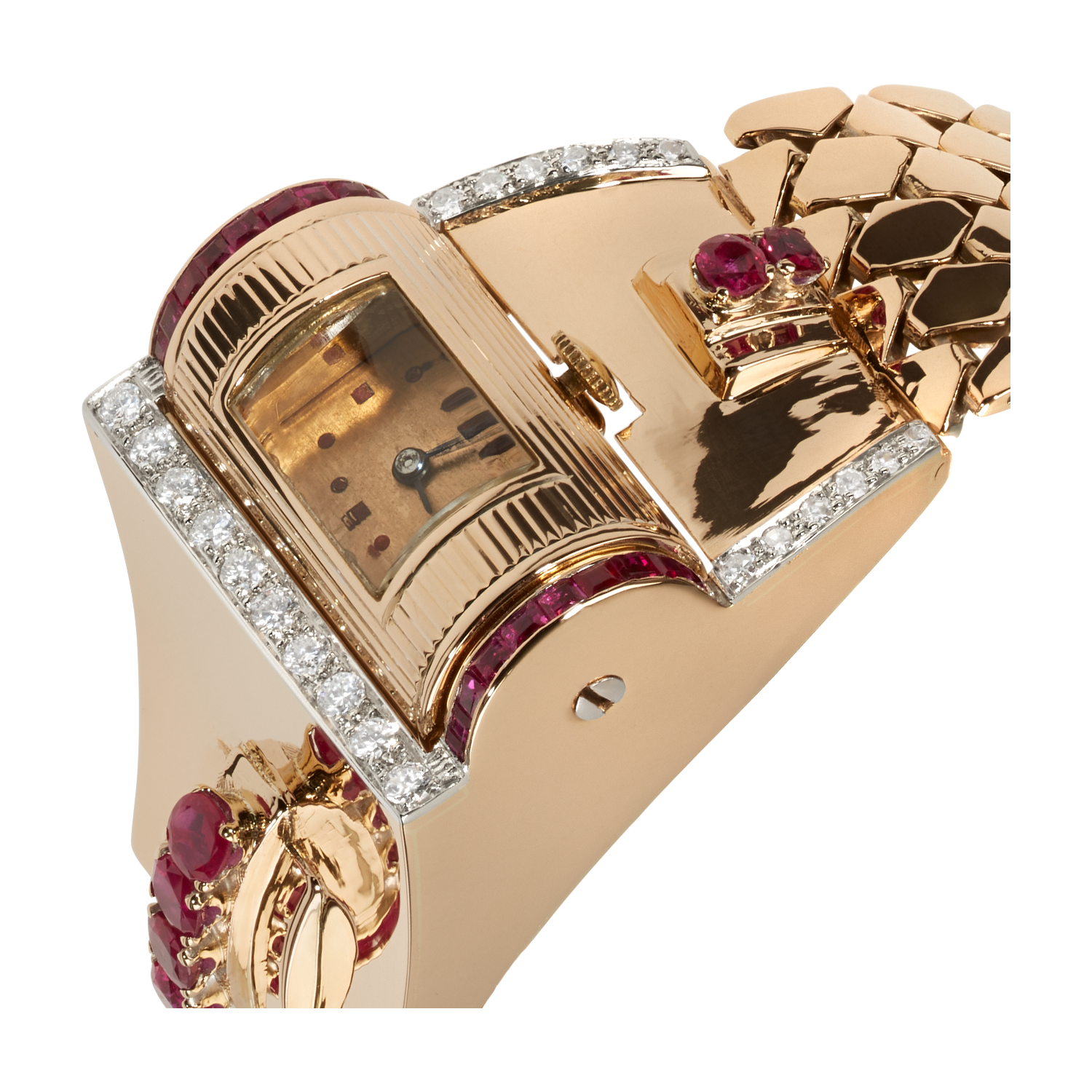 Extraordinary designer women's watch in 14K (585) rose gold with links made of rose gold, box clasp with flap closure, case set with 6 oval rubies and calibrated carré-cut rubies, totalling approx. 1 carat, fine platinum overlay with 22 pavé-set full-cut and 8/8 diamonds, totalling approx. 1.40 carats, domed plexiglass, movement integrated into a rotating barrel, manual winding, very daring design, lightweight construction, handmade
