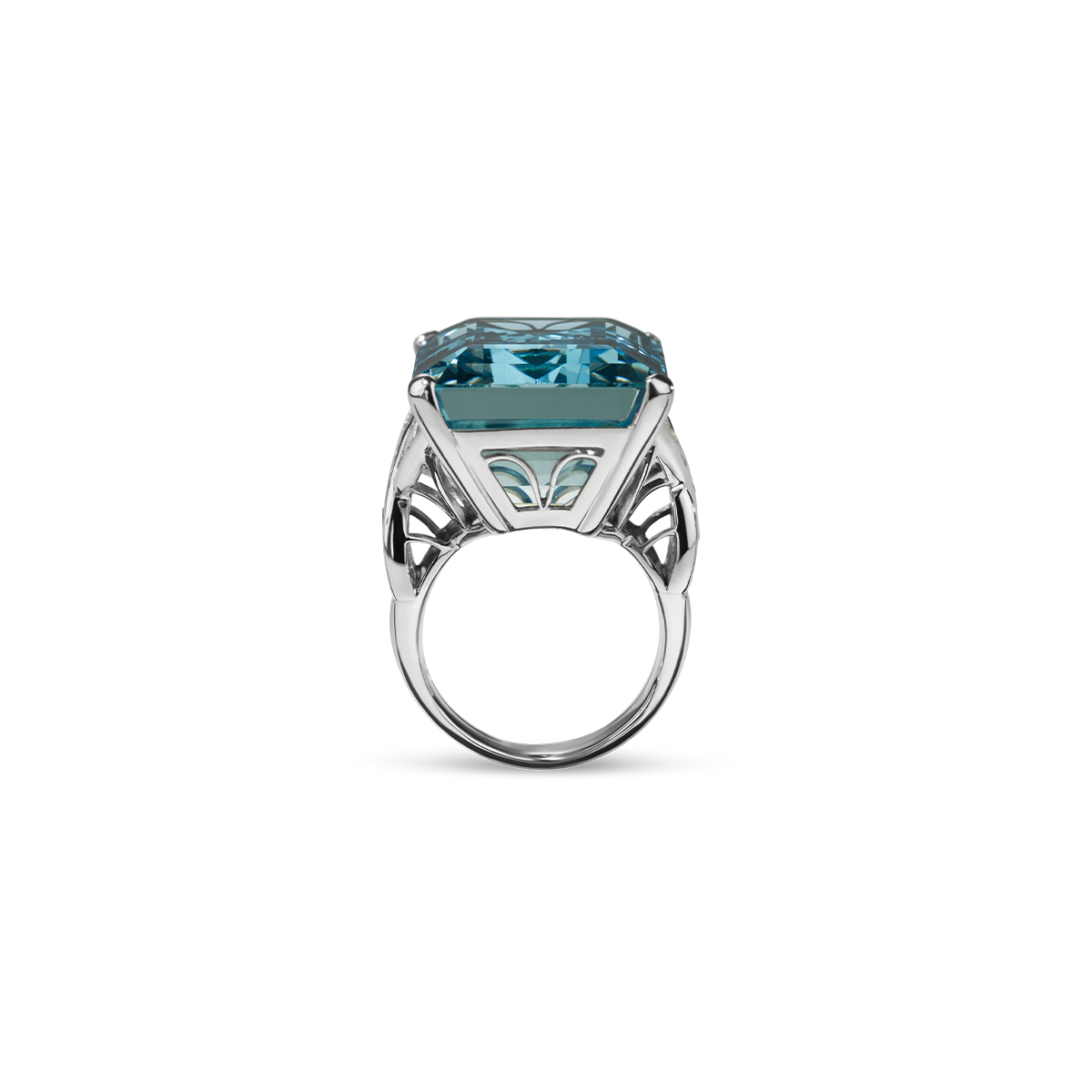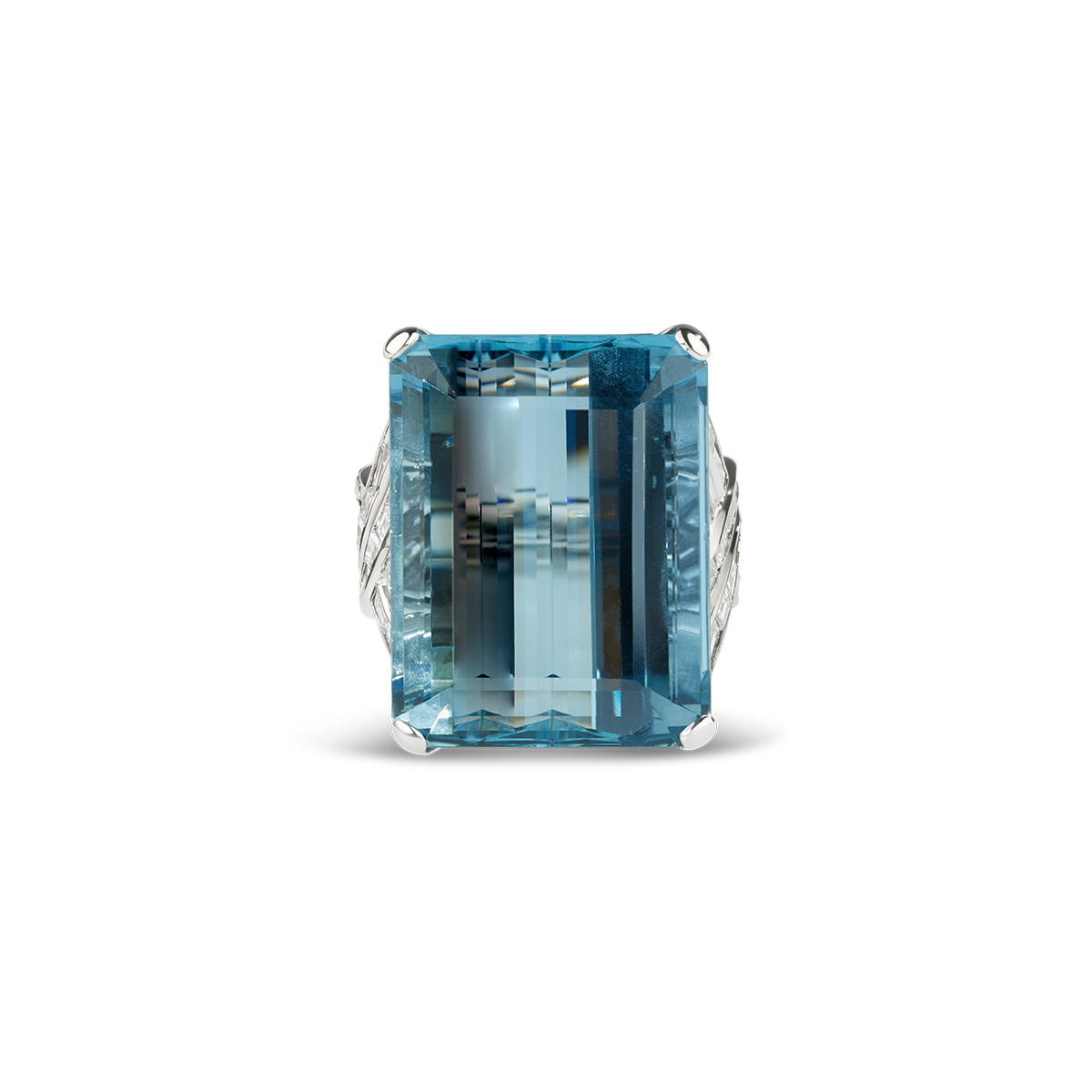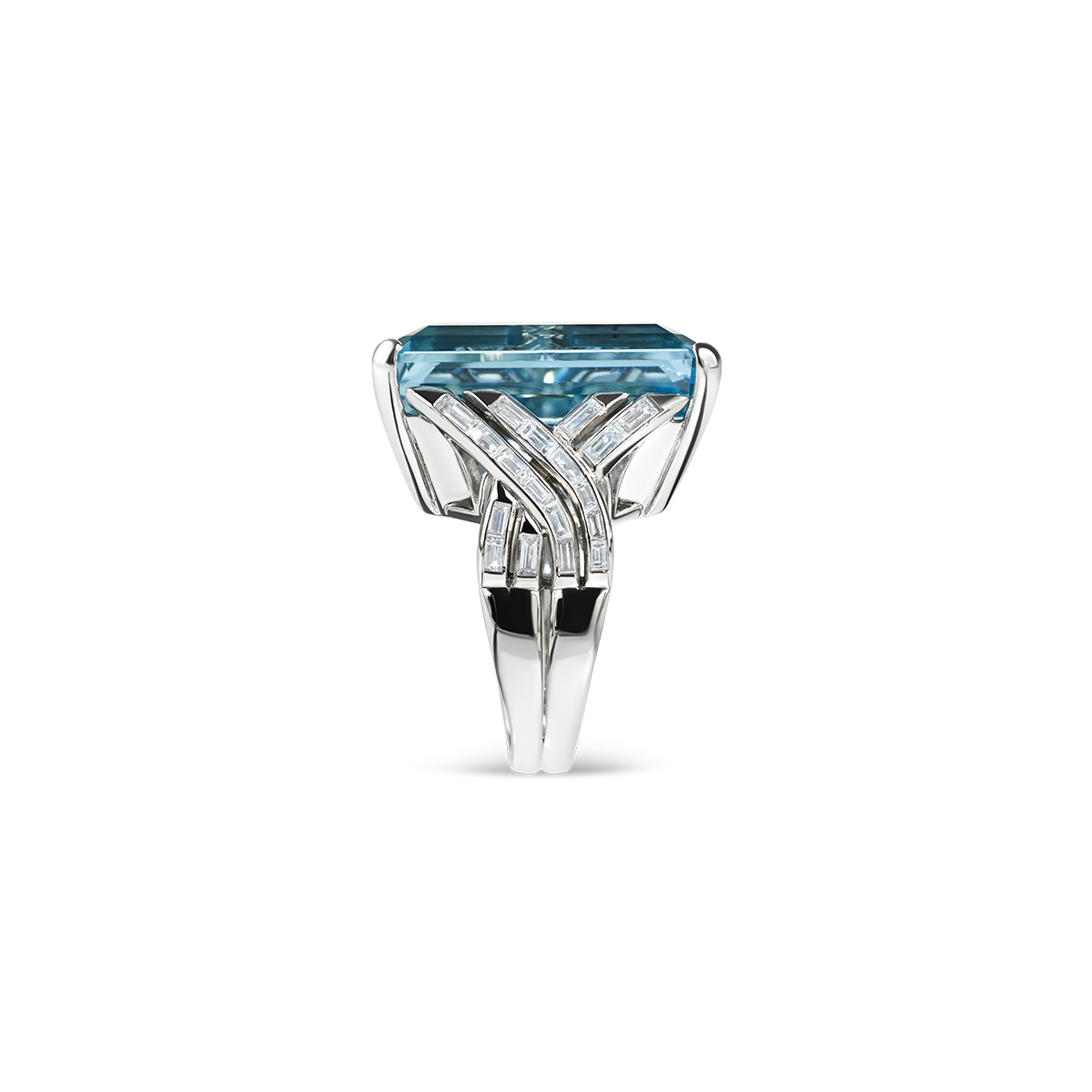 Distinctive women's ring in platinum (850-900), center set with an octagonal, fine aquamarine weighing approximately 36.5 carats, 22.83 x 17.58 x 11.93 mm, blue color (GRS-type "Santa Maria" color), small inclusion on the table, flanked by cross-bands set with 36 diamond baguettes totalling approx. 2 carats, beautiful craftsmanship