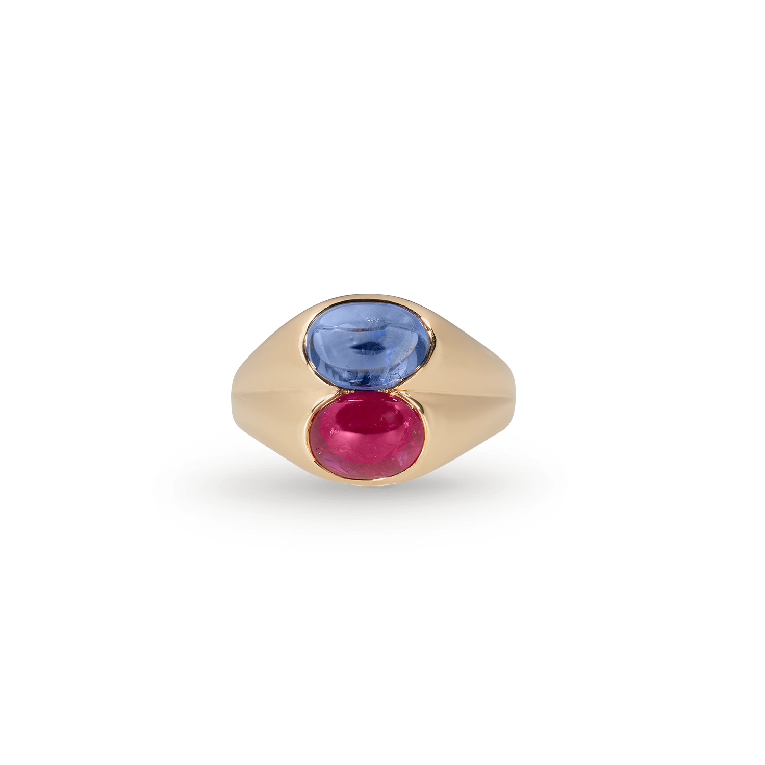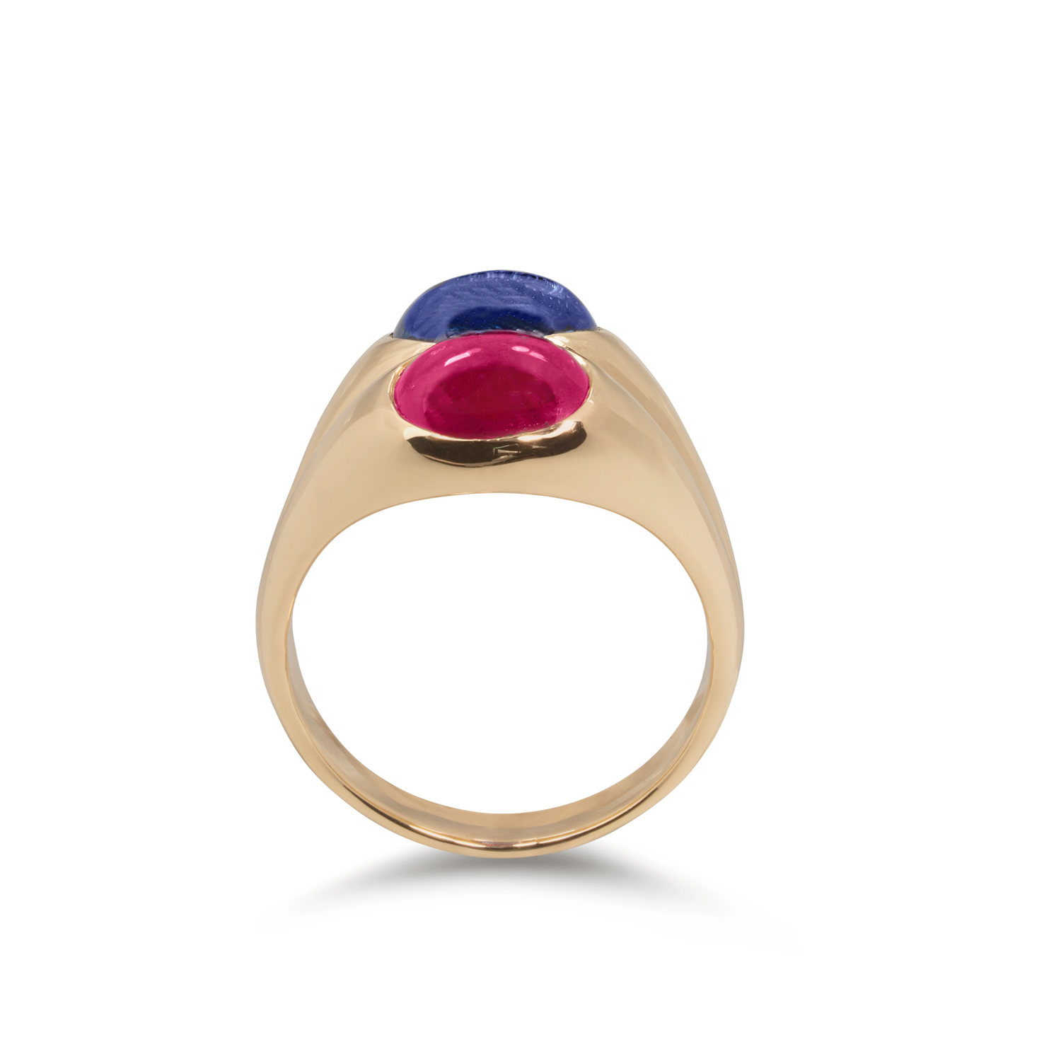 Double ring in 18K (750) yellow gold, likely made in France, one band set with an oval ruby cabochon of a beautiful saturated red, weighing approximately 1.85 carats, circa 7.5 x 5.9 x 4.0 mm, one band set with an oval sapphire cabochon of a beautiful light blue, weighing approximately 2.21 carats, 8.0 x 5.8 x 4.2 mm, both stones are unheated and originate from Burma (Myanmar), handmade