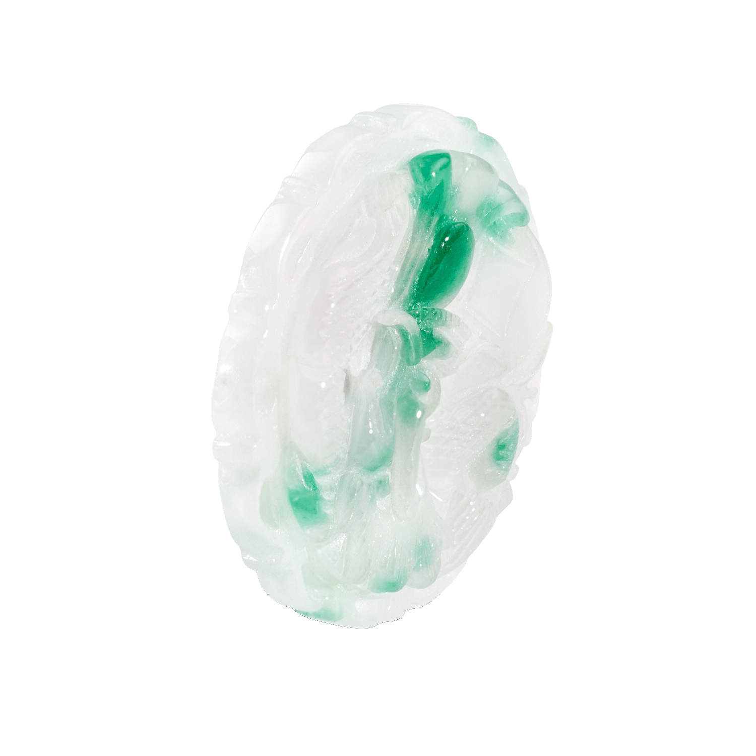 Round, beautifully engraved jadeite disc weighing 306.6 carats, untreated, green to colourless, fine craftsmanship