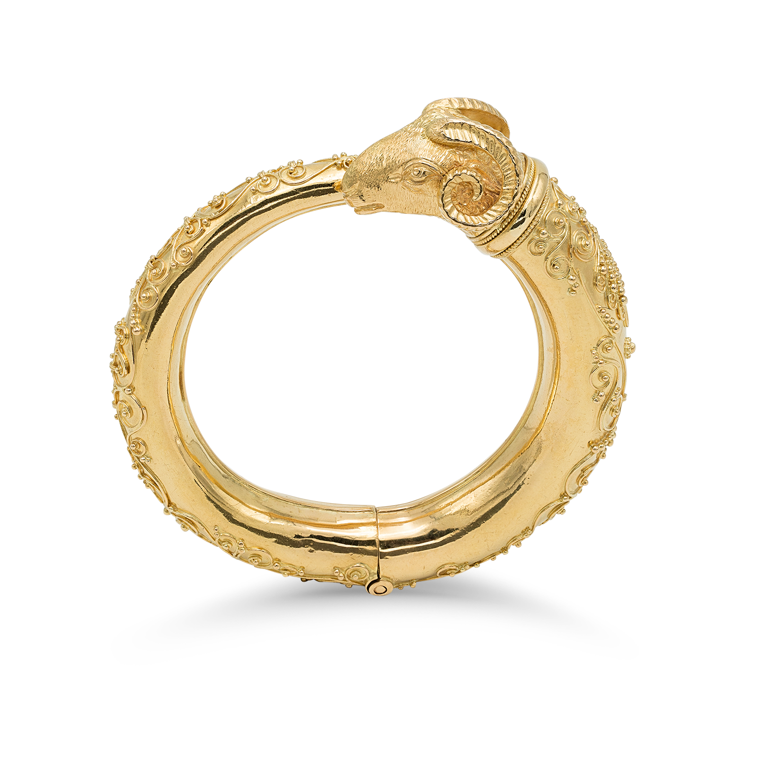 Impressive, asymmetrical bangle in yellow gold 20-22K (approximately 910), in an archaeological Etruscan style, a beautifully sculptured Ram’s head with engraved fur, everything decorated with granulated globules and tendril motives, mechanism with a built-in spring on the backside to open, handmade