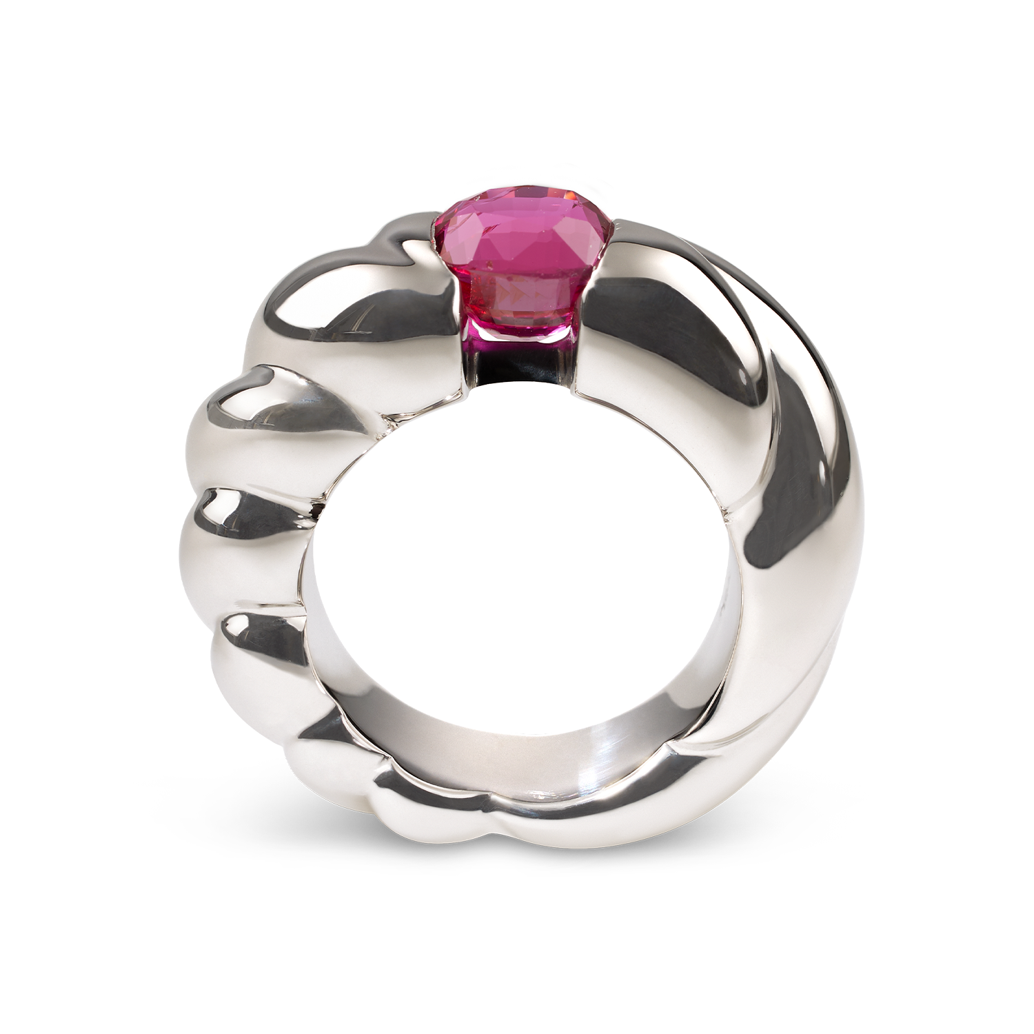 Very special cord-style design ring in 18K (750) white gold set with a sensational ruby weighing 2.296 carats, 7.4 x 6.4 x 5.5 mm, unheated, brilliant-step/cushion cut, vivid pinkish-red, minimal traces of wear, handcrafted
