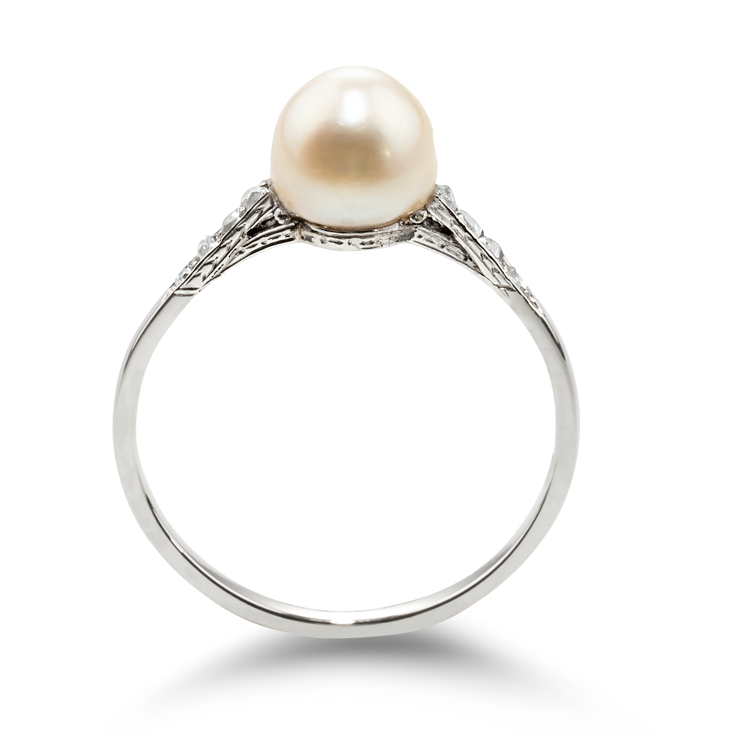 charming, fine, elegant pearl ring in platinum, set with a creamy-white natural pearl, button-shaped, circa 7 mm, GGTL report no. 20-B-5327, shoulders embellished with 4 grain-set rose-cut diamonds, handmade