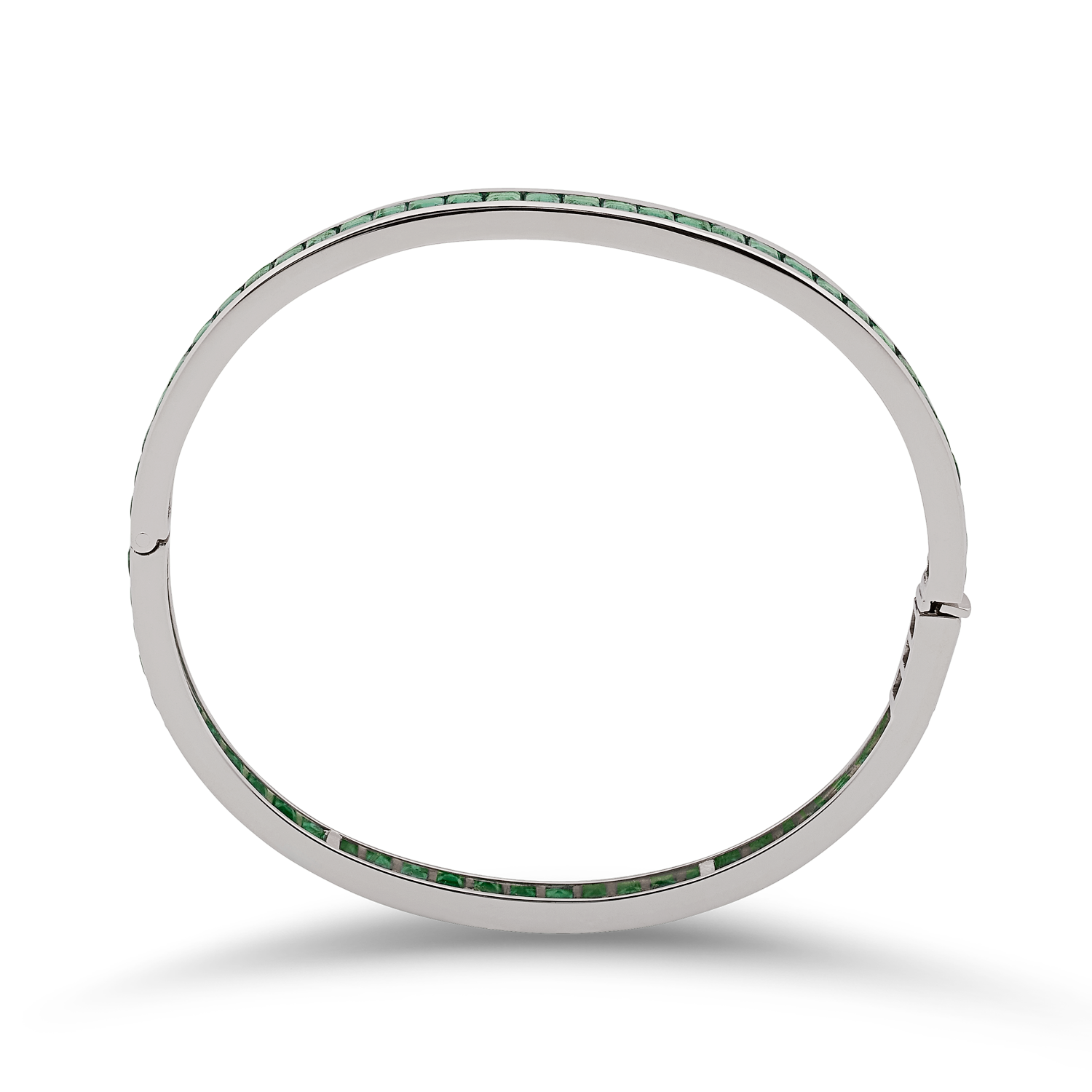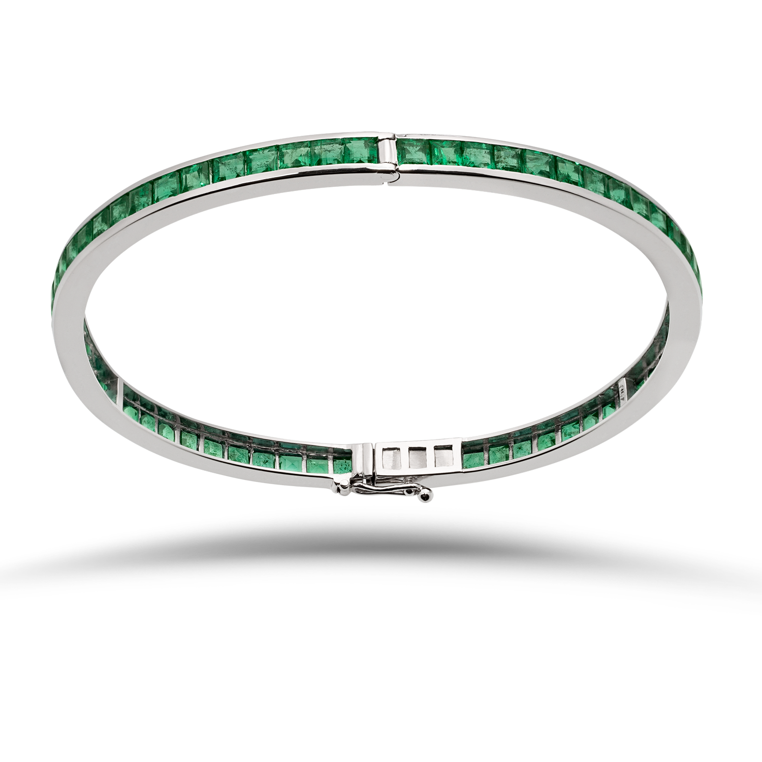 In 18K (750) white gold, set with 65 choice carré-cut emeralds, circa 2.7 x 2.8 mm, weighing a total of circa 6.5 carats, relatively saturated green, built-in box clasp with side safety clasp, unworn, like-new, very fine craftsmanship