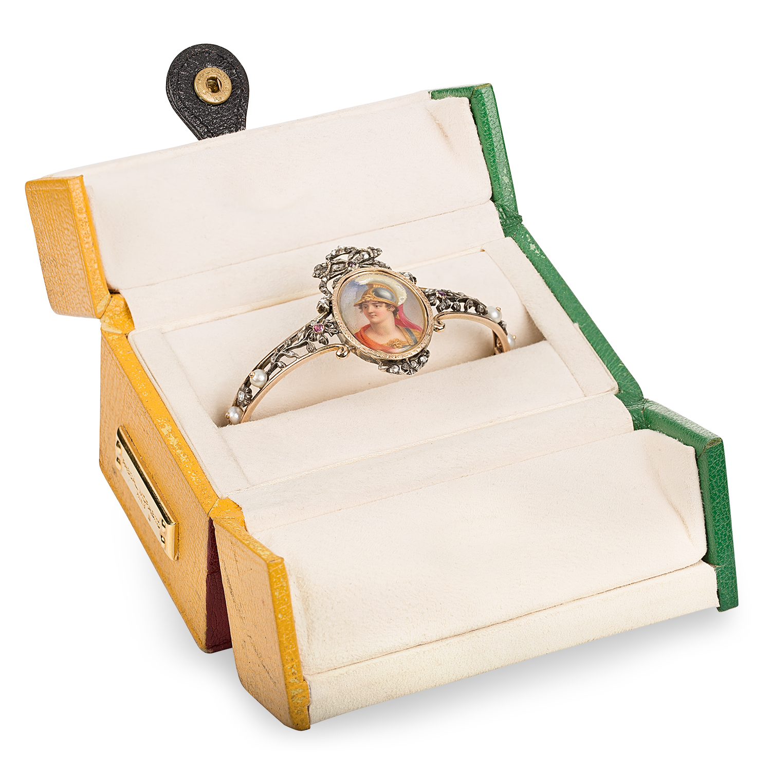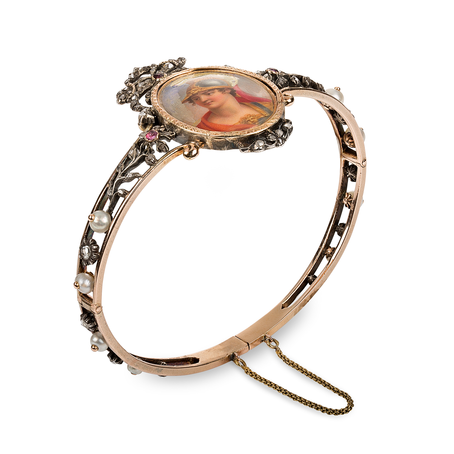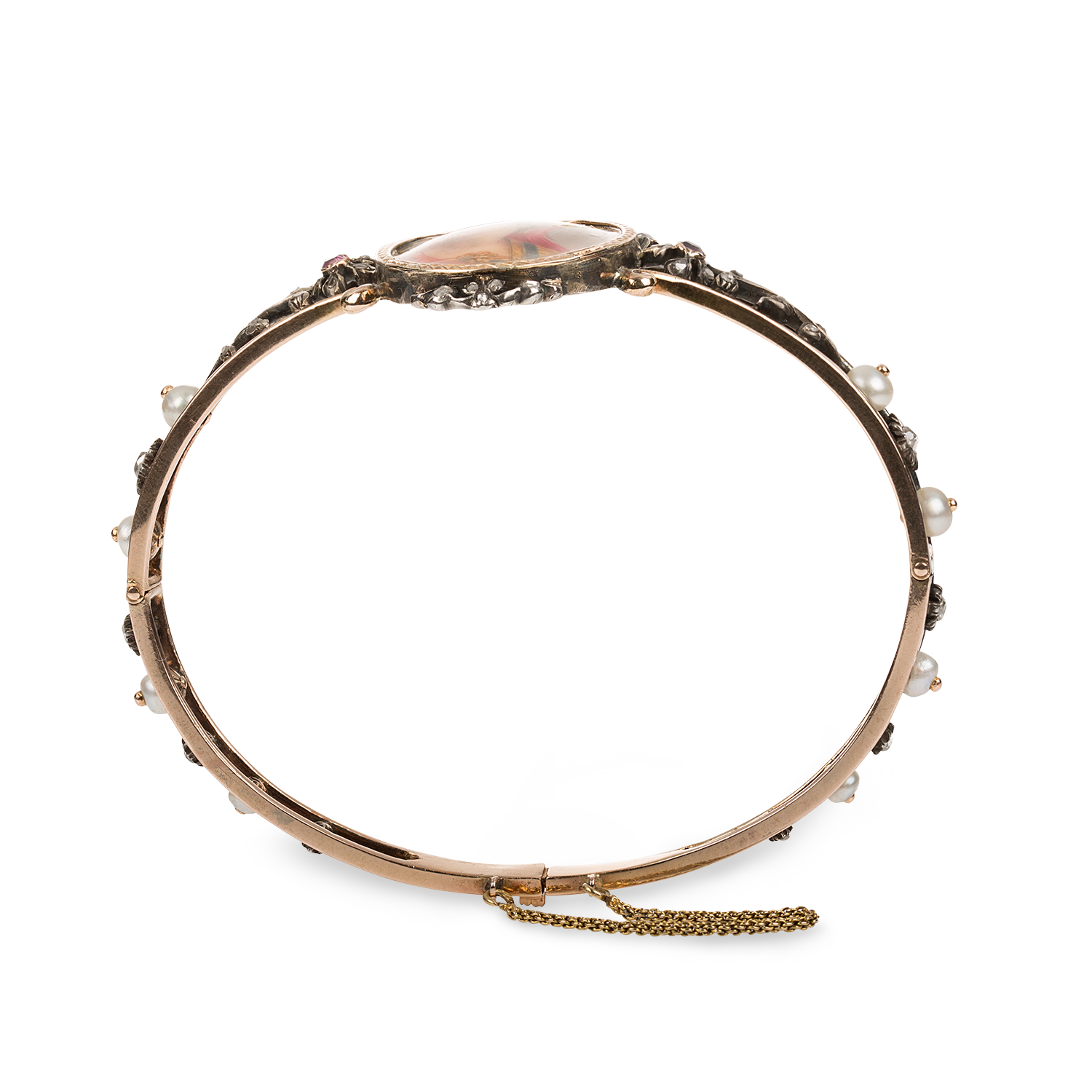 In 18K (750) rose gold and silver, attractive bangle with a double hinge and safety chain, polychrome miniature in the center with image of a young dame from antiquity wearing helmet jewellery, the image has been restored, surrounded by mesh design, bangle set with 8 small natural pearls, 3 small red stones and circa 70 rose-cut diamonds, handmade