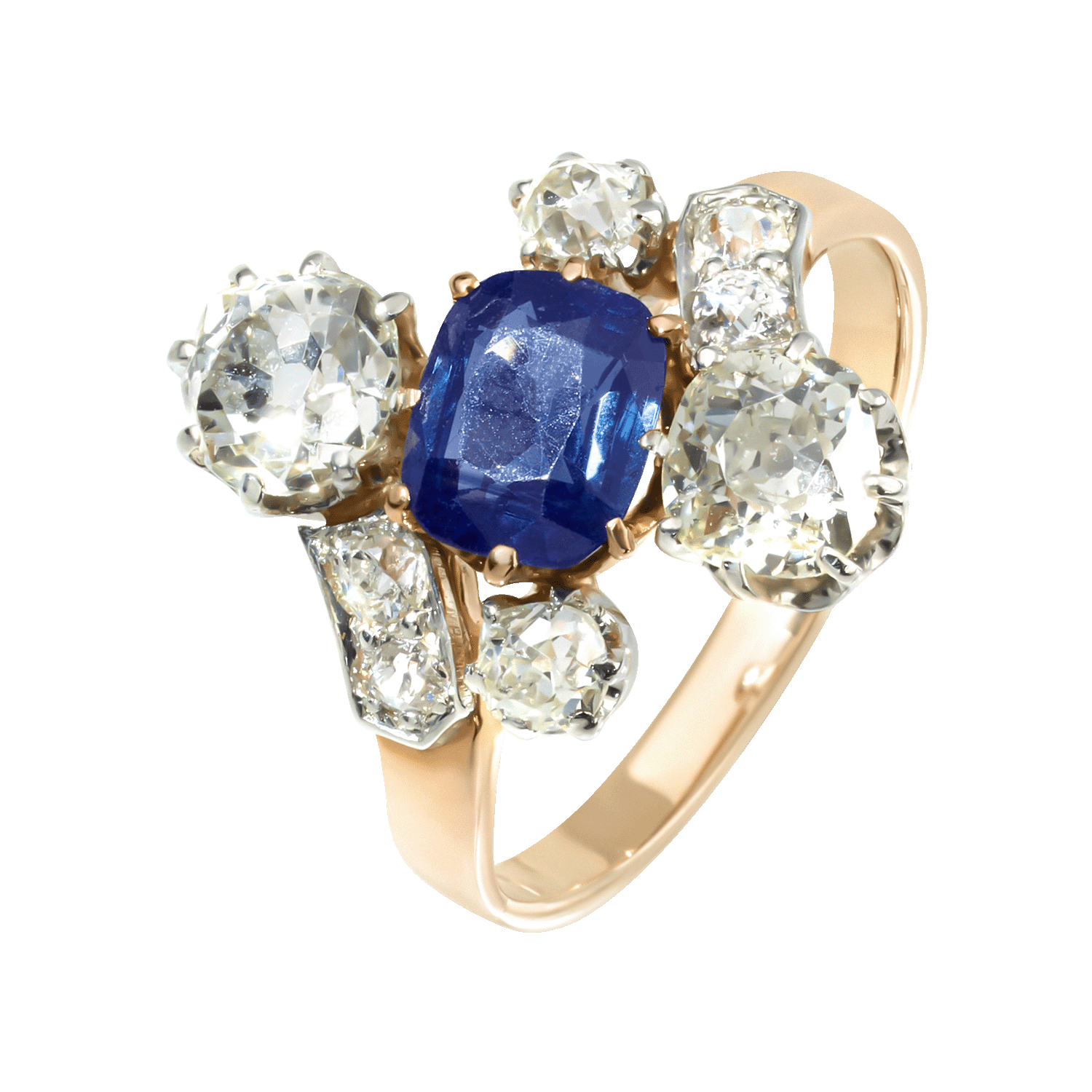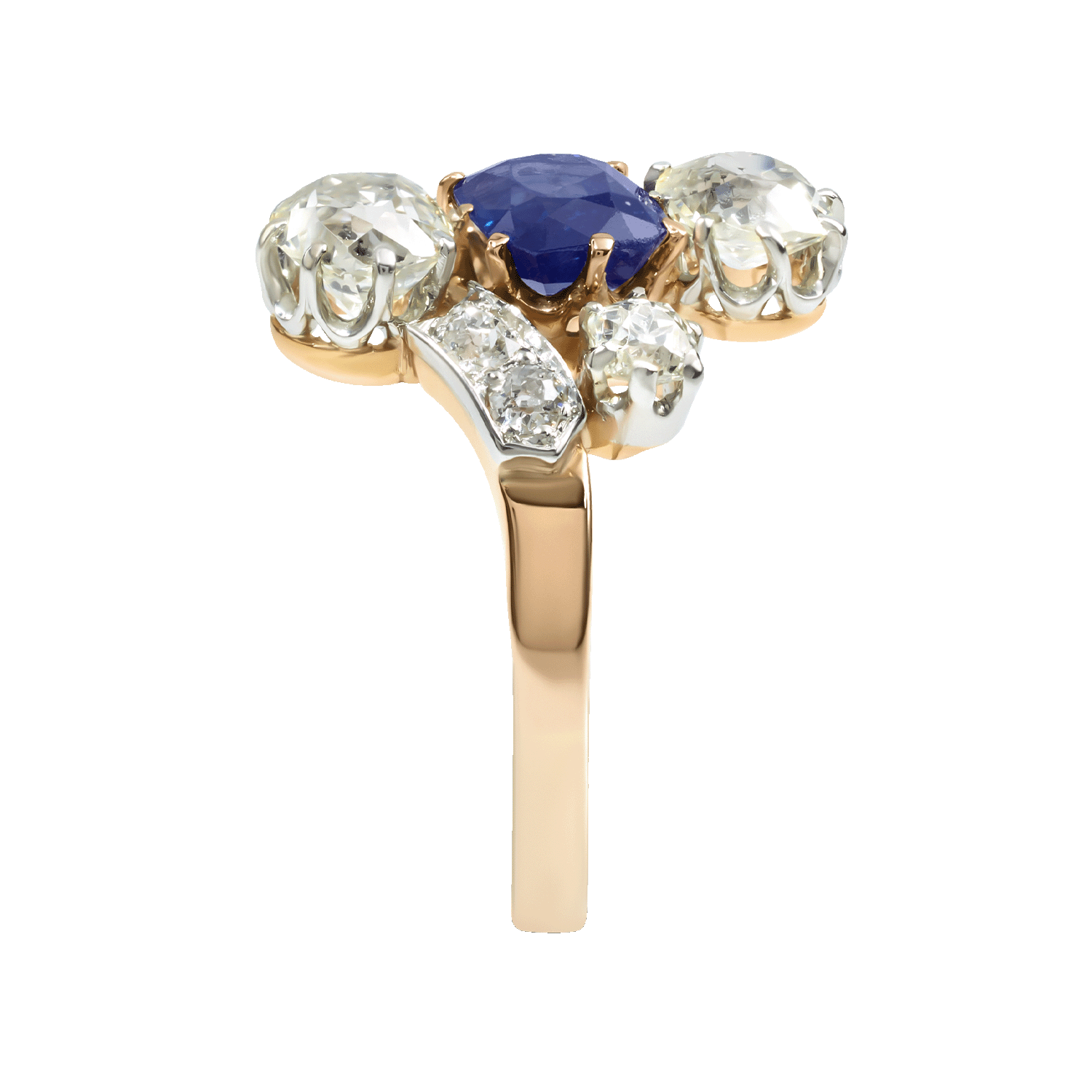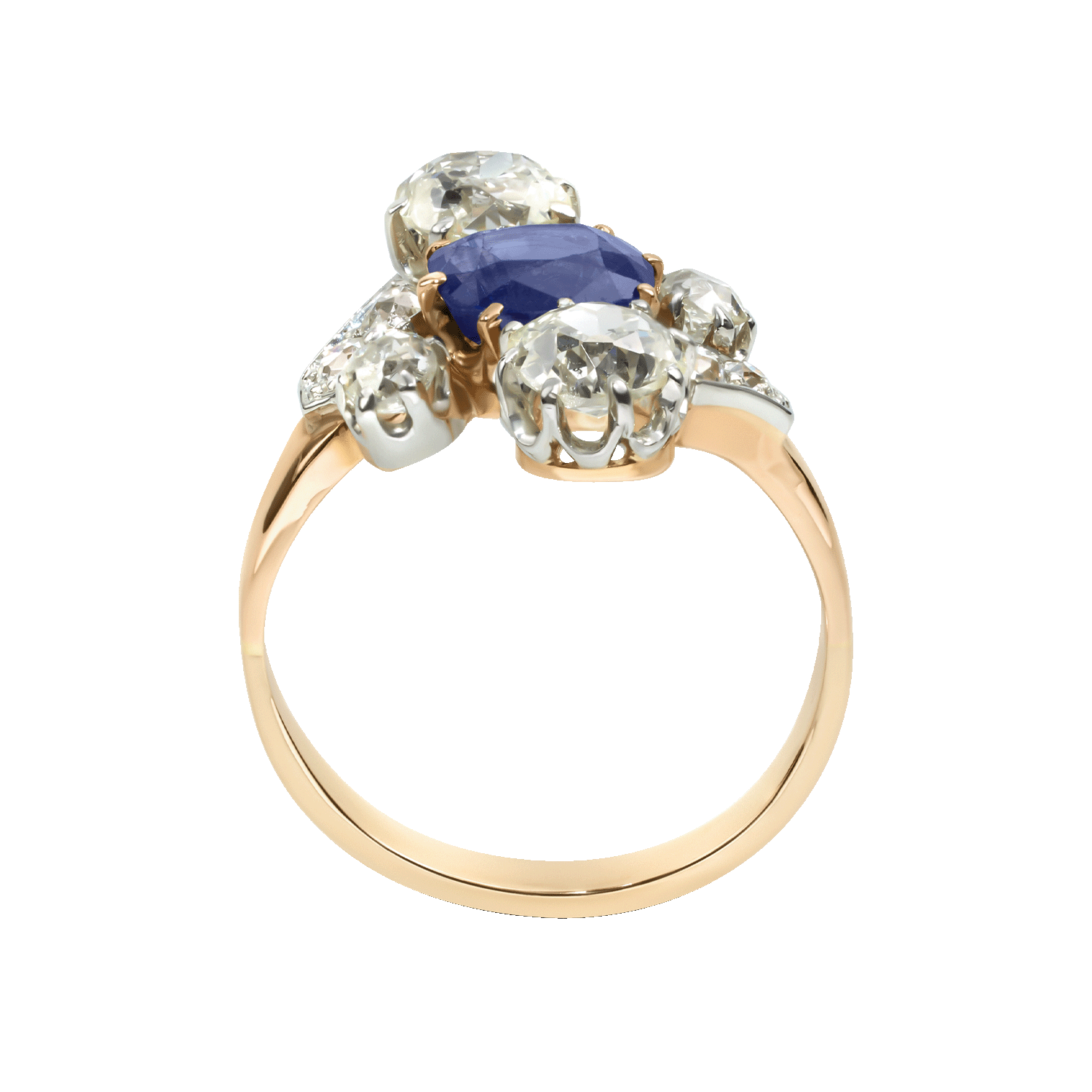Festive crossover women’s ring in 18K (750) red gold and platinum, center set with an antique oval-cut dark sapphire weighing circa 0.8 carats, surrounded by 2 larger old-cut diamonds weighing circa 0.45 carats each, K-P/si-P1, as well as 6 smaller diamonds, total diamond carat weight circa 1.3, fine quality craftsmanship