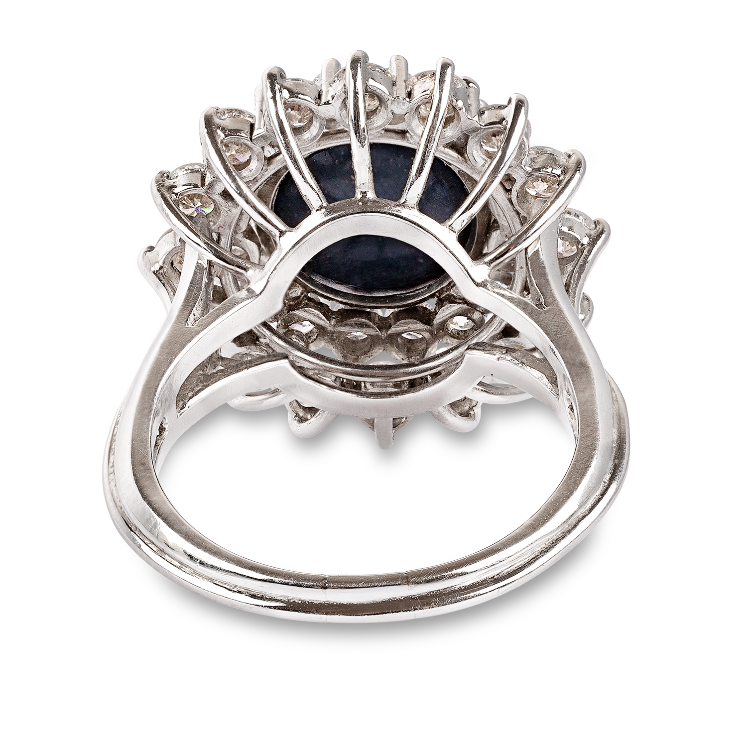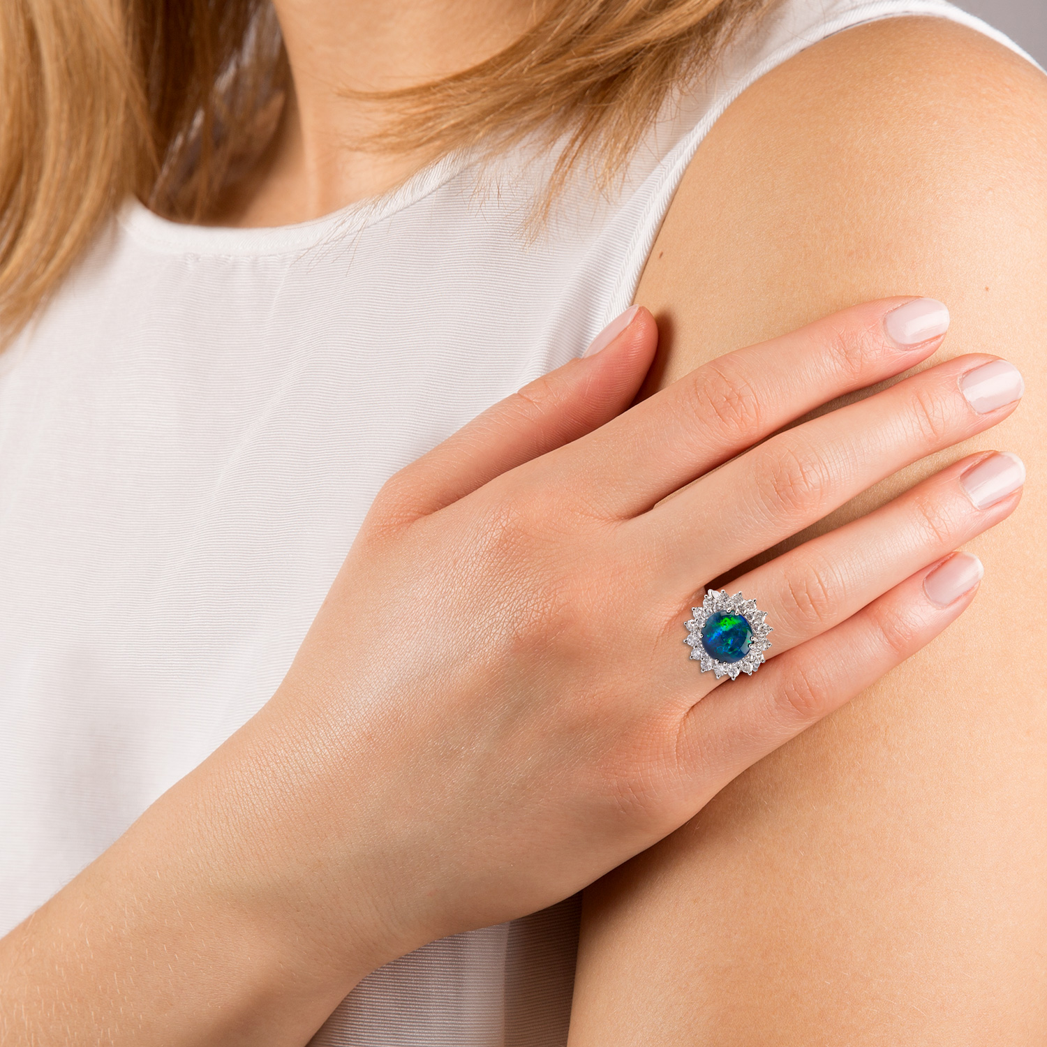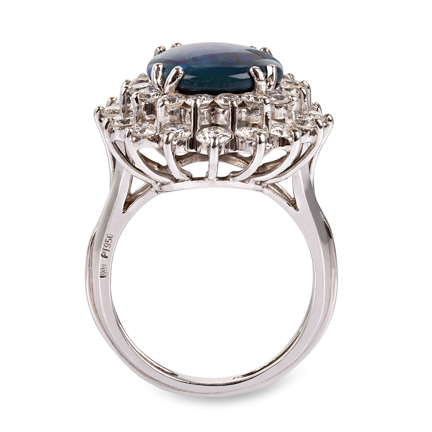 Decorative entourage ring in platinum (950), set with a round natural black opal weighing 3.41 carats, cabochon, 11.50 x 11.15 x 4.88 mm, (probably Lightning Ridge) green/blue, strong round transition, originating from Australia, double entourage with 32 round brilliant diamonds weighing a total of circa 1.90 carats, top wesselton/if-vs, handmade