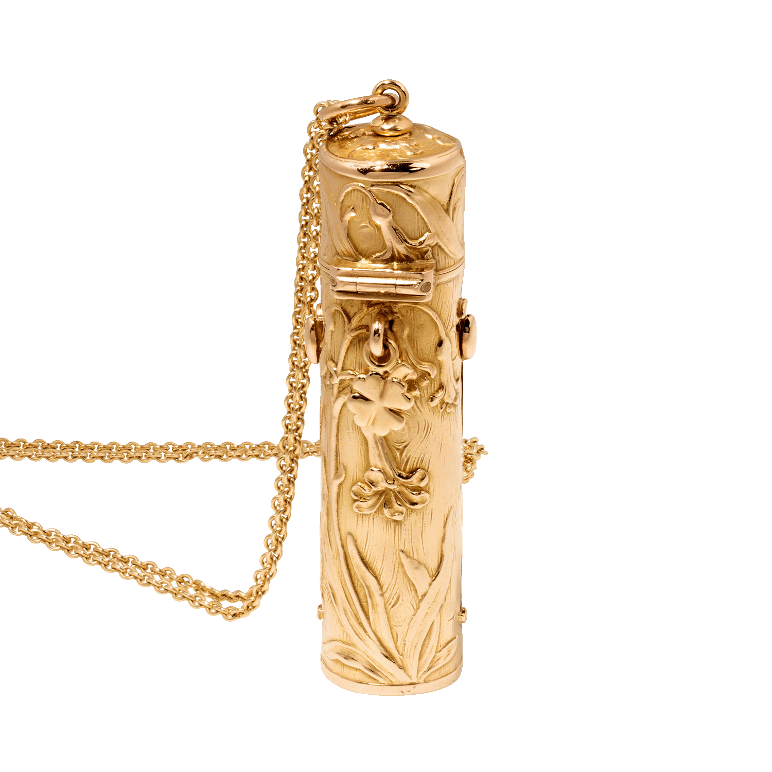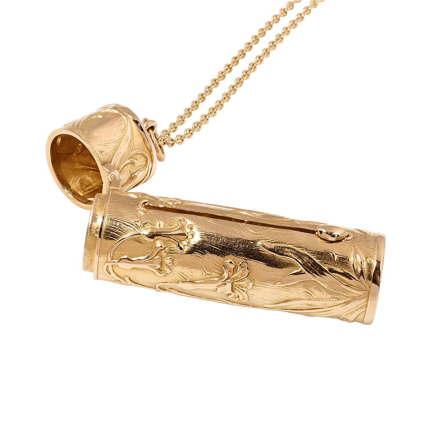 In 18K (750) yellow gold, charming, bold pendant for lipstick, French, with romantic plant and floral design, with small loop and pendant loop for a chain, handmade