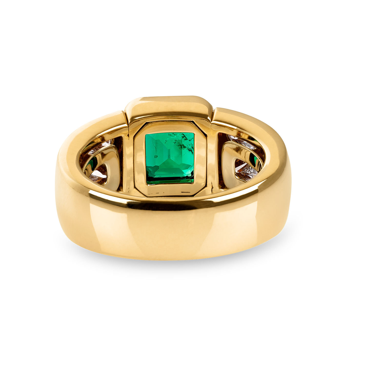 Excellently crafted ring in 18K yellow gold, set with an octagonal emerald weighing circa 1.85 carats, 8.0 x 7.0 x 4.2 mm, very beautiful vivid green colour, with 4 pear-cut diamonds weighing a total of circa 0.77 carats, top wesselton/vvs-vs, handmade, Péclard no. RBF/0269, with spring insert in band