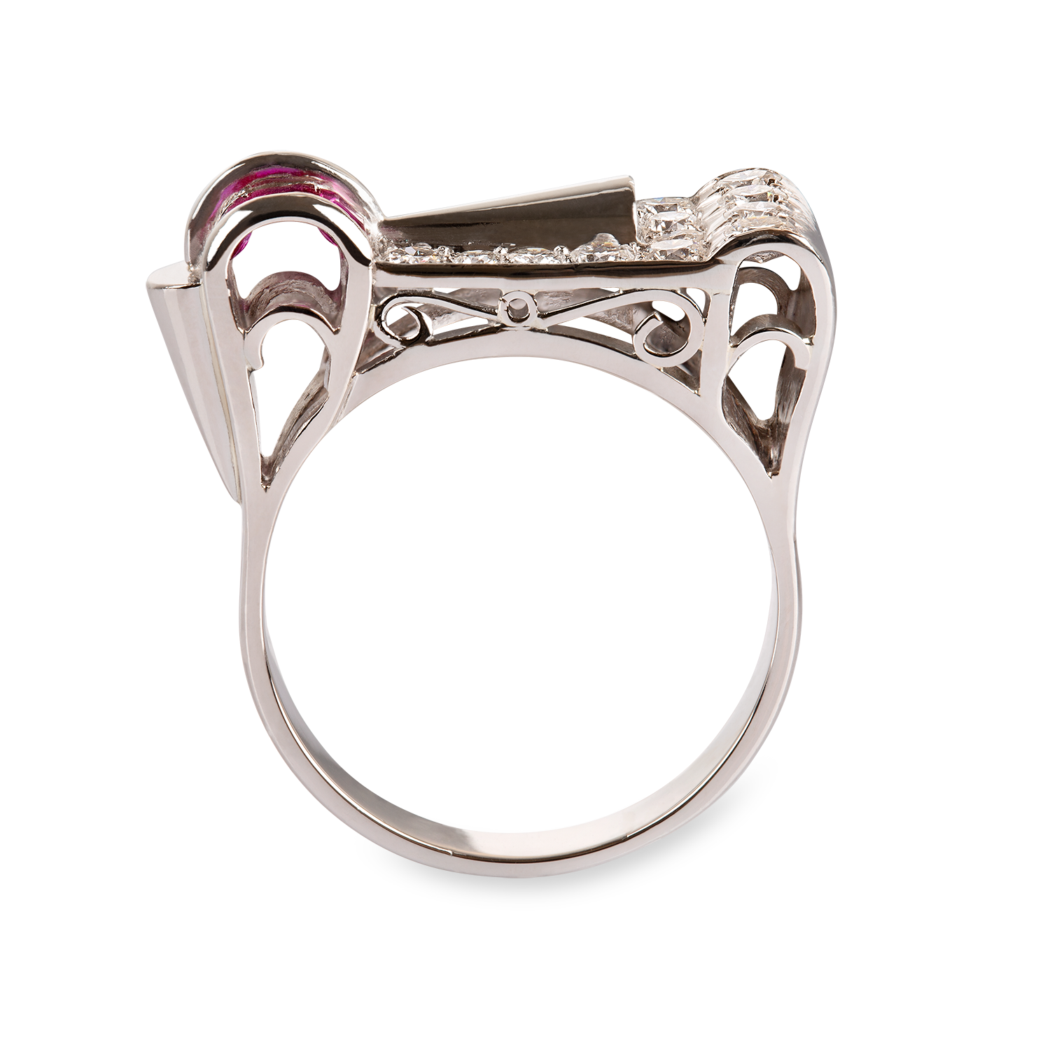 Fast-paced industrialization and new developments pave the way for the transition into modern society, bringing forth the modern woman. She now appears and behaves like the American movie stars – smoking, dancing and listening to jazz. Her hair is short and she is active and boyish. Jewellery from this period suits this image with its geometric, austere and distinct design. Inlays of precious stone, diamonds and enamel yield distinctive pieces of jewellery with stark one colour contrasts. Innovations, such as the invisible setting from Van Cleef & Arpels, also pave the way for unprecedented jewels.