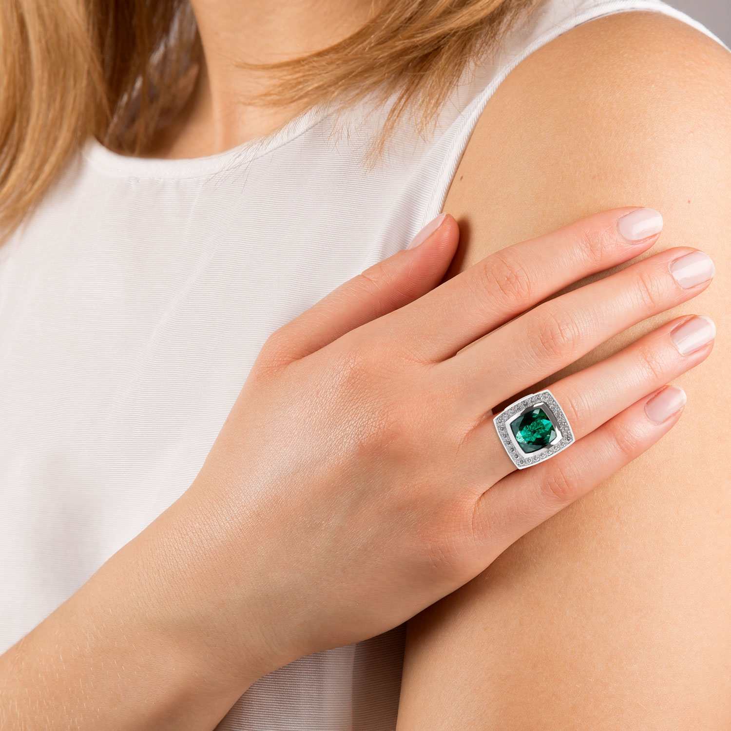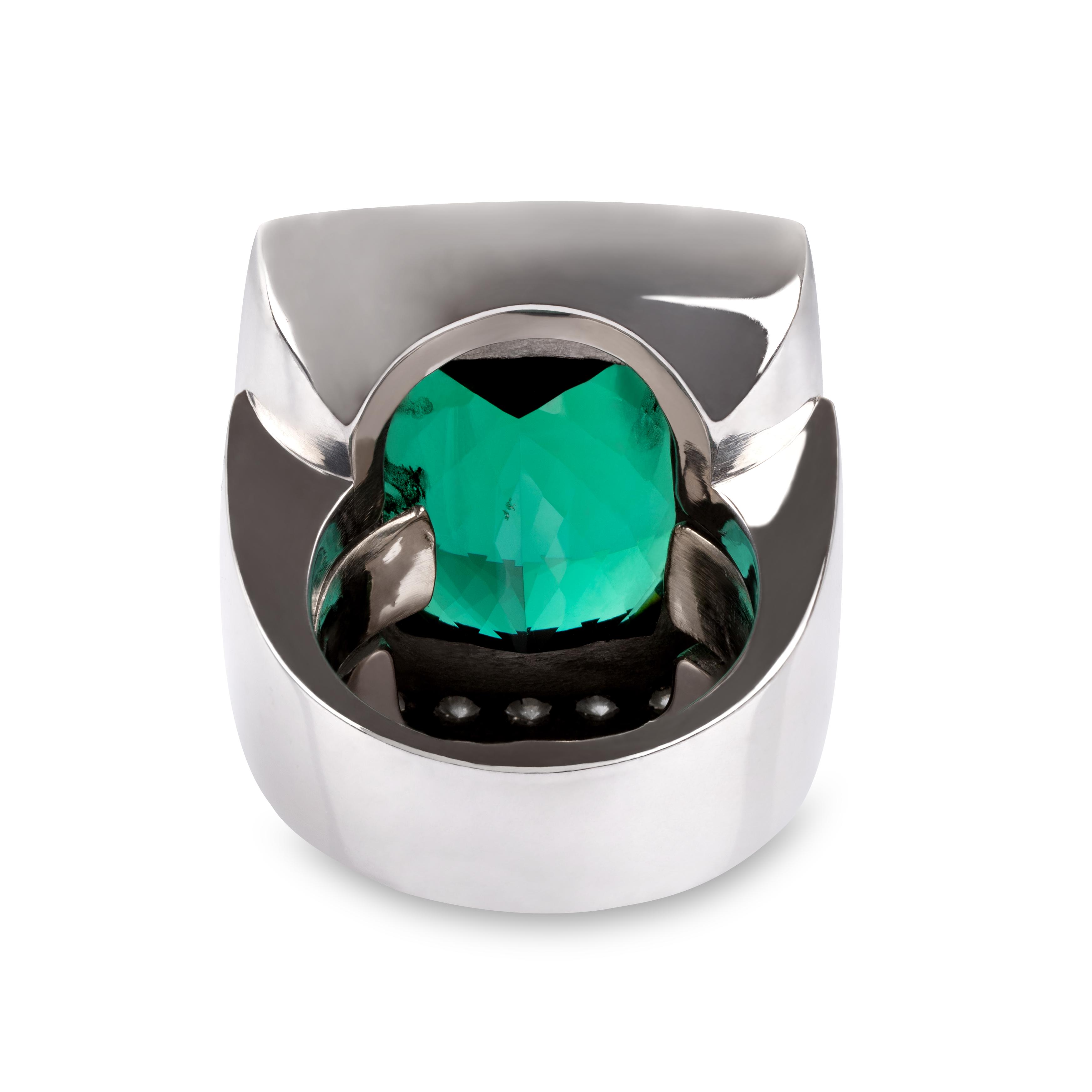 In 18K white gold, rectangular, slightly concave ring head set with a green indicolite (tourmaline) 15.8 x 15.6 x 10.7 mm, approximately 21 carats, not heated according to certificate, surrounded by 26 round brilliant diamonds weighing a total of approximately 2.60 carats, polished finish, handmade