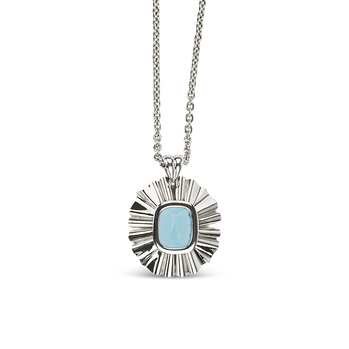 Majestic aquamarine pendant in 18K (750) white gold, center set with a fine aquamarine cushion weighing circa 25 carats, 20.5 x 17.5 x 11mm, natural aquamarine, GRS-Type "Santa Maria" (color), with an entourage of 26 brilliant-cut diamonds, wesselton vsi, weighing a total of 2.1 carats, encircled by a curled frame, reminiscent of a noble collar, with a movable loop suspension