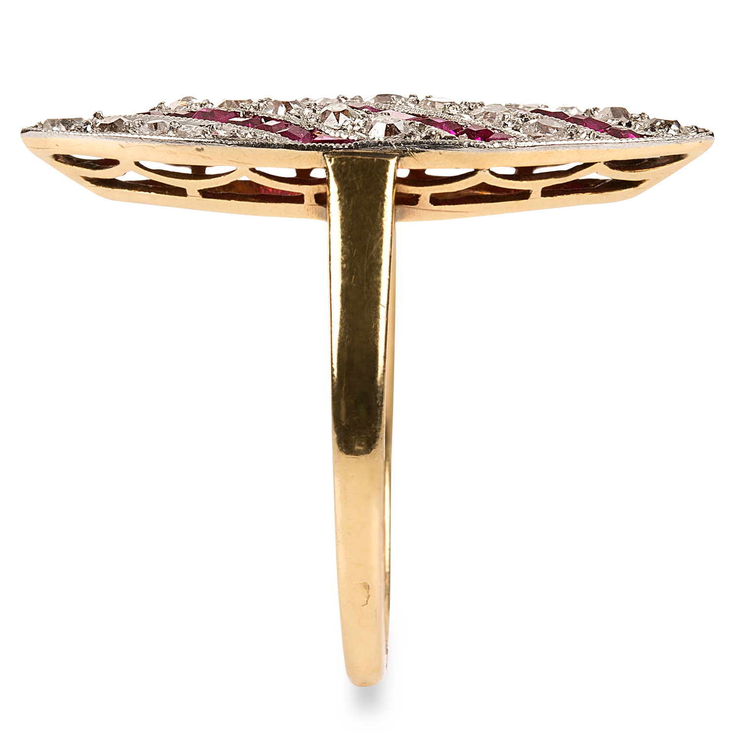 In 18K (750) yellow gold with platinum table, possibly from Switzerland around 1900, set with 20 rose-cut diamonds weighing a total of circa 0.5 carats and 24 ruby carrés weighing a total of circa 0.5 carats, navette shape, band design, handmade