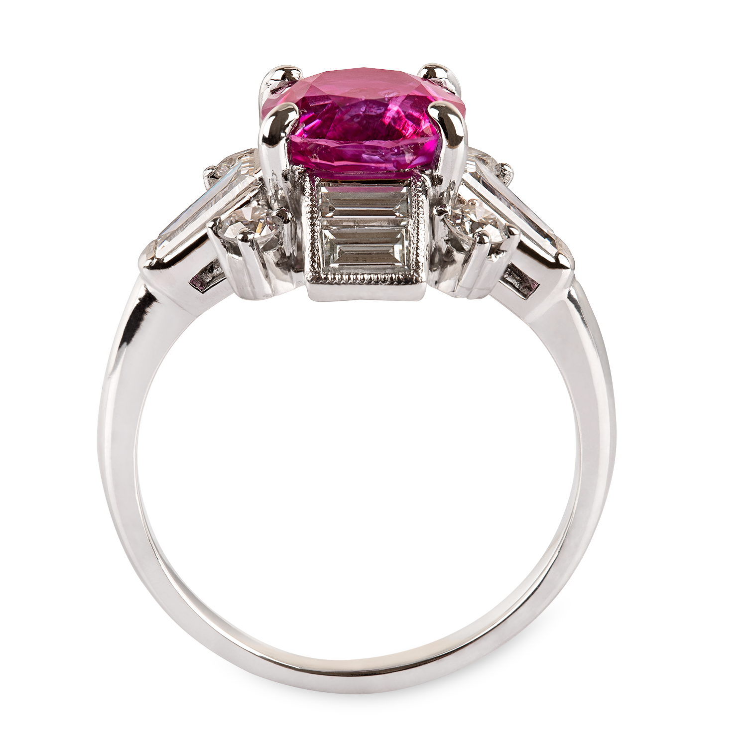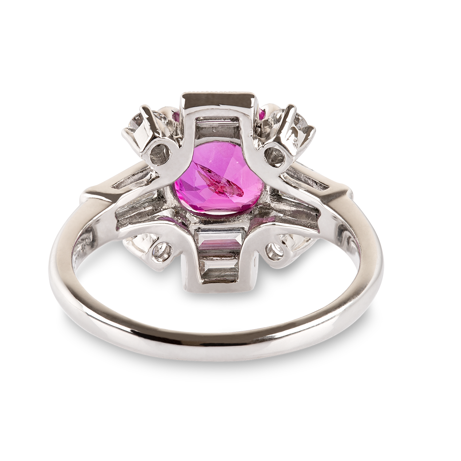 In 900 platinum, 10% iridium, centre set with a fine round ruby weighing 2.69 ct., 8.18 x 7.97 x 4.70 mm, Burma, cut crown/pavilion, no heat, fine purplish red, surrounded by 2 trapeze-cut diamonds, 4 baguette-cut diamonds and 4 small round brilliant diamonds, weighing a total of circa 1 carat, handmade