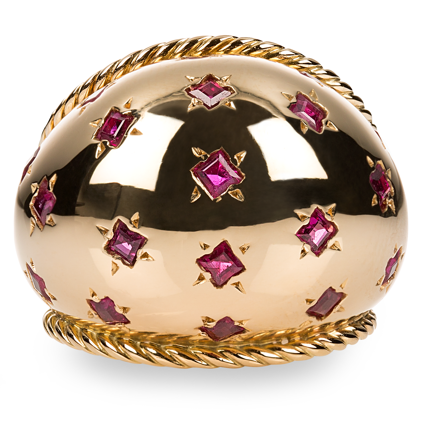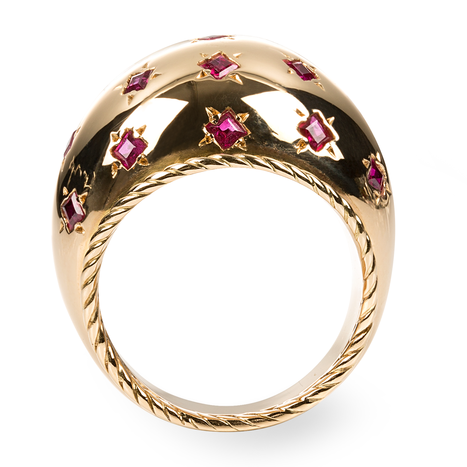 In 18K (750) yellow gold, with red starry sky design, set with 19 ruby carrés, total carat weight circa 0.6, two twine rings mounted laterally, handmade