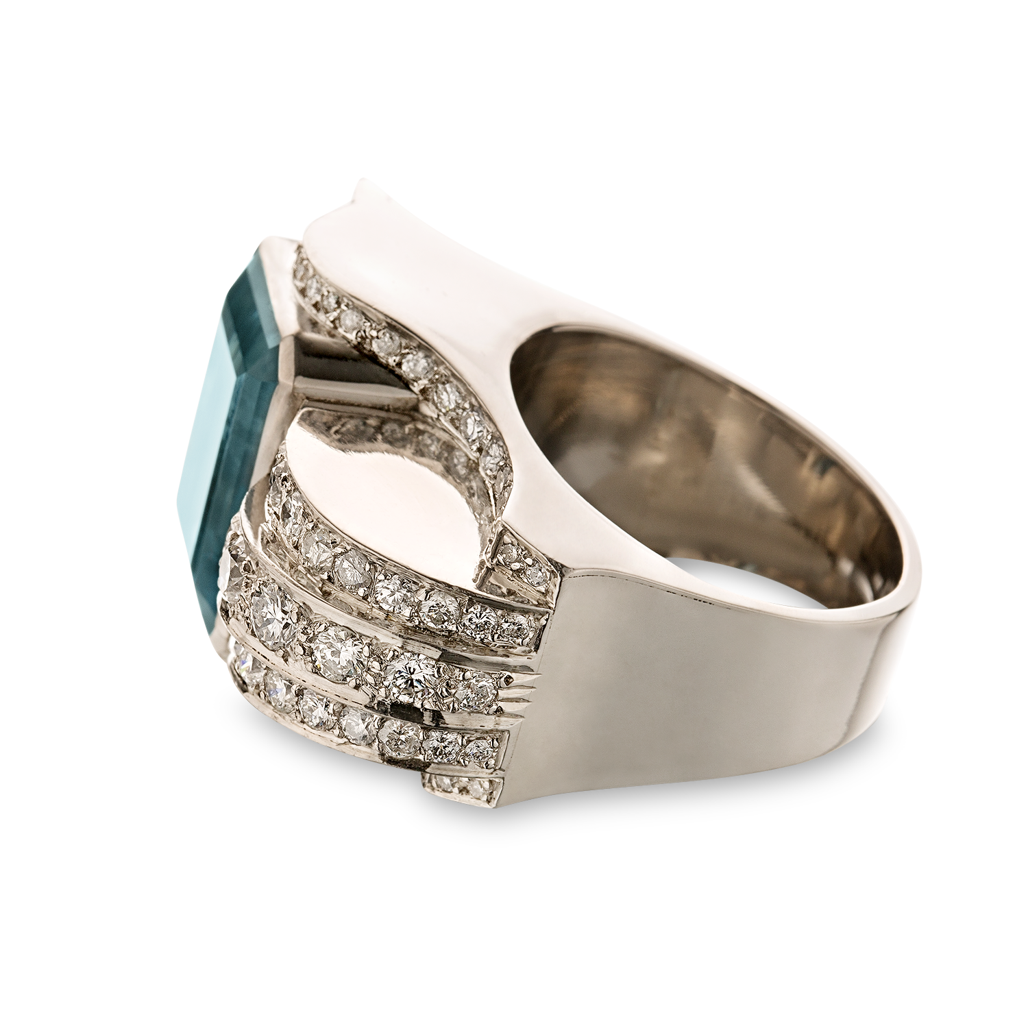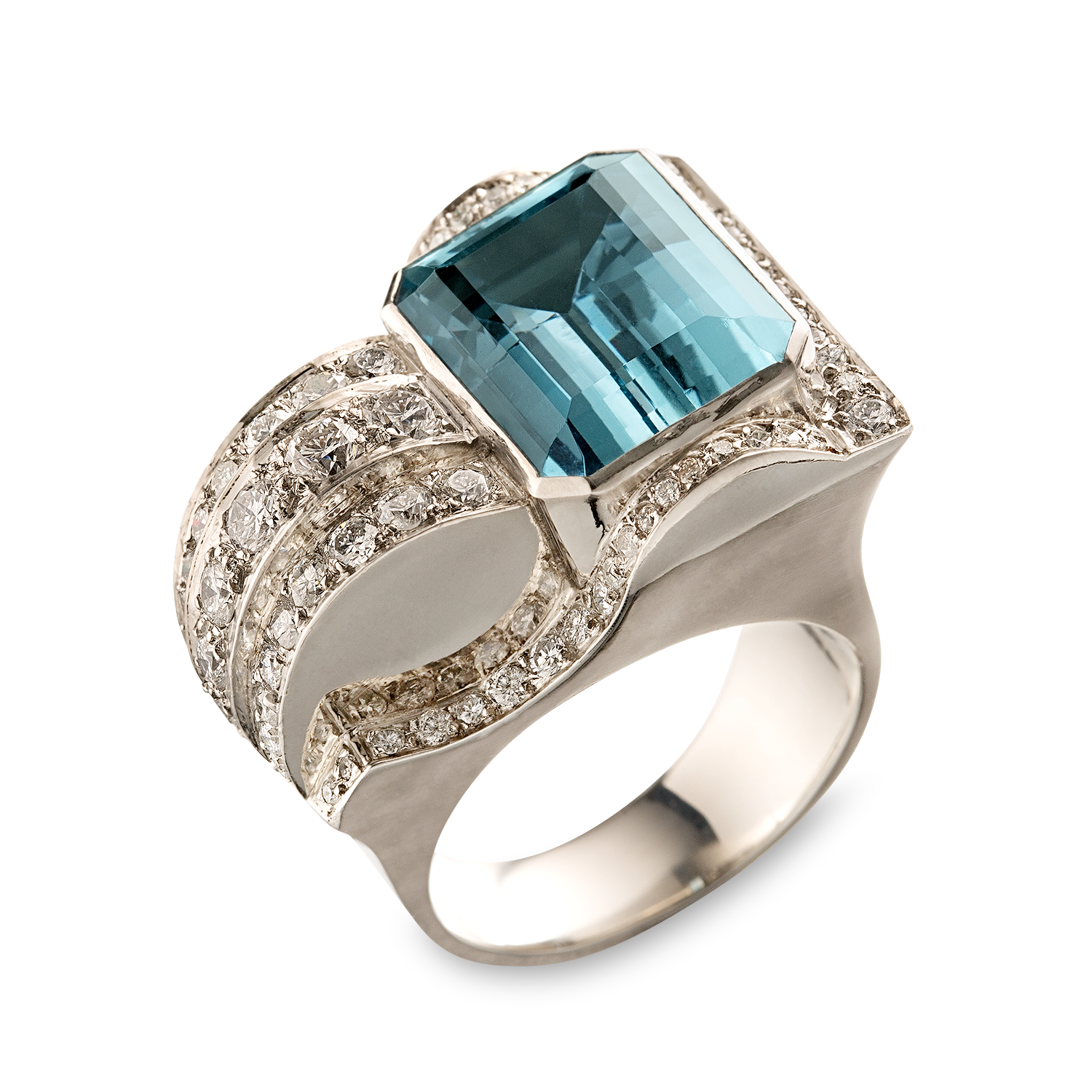 In platinum (950), striking retro design, France, set with a beautiful octagonal aquamarine weighing circa 12.4 carats, 15.9 x 12.9 mm, pastel blue, heat-treated, with a banded front side set with round brilliant diamonds, fine craftsmanship