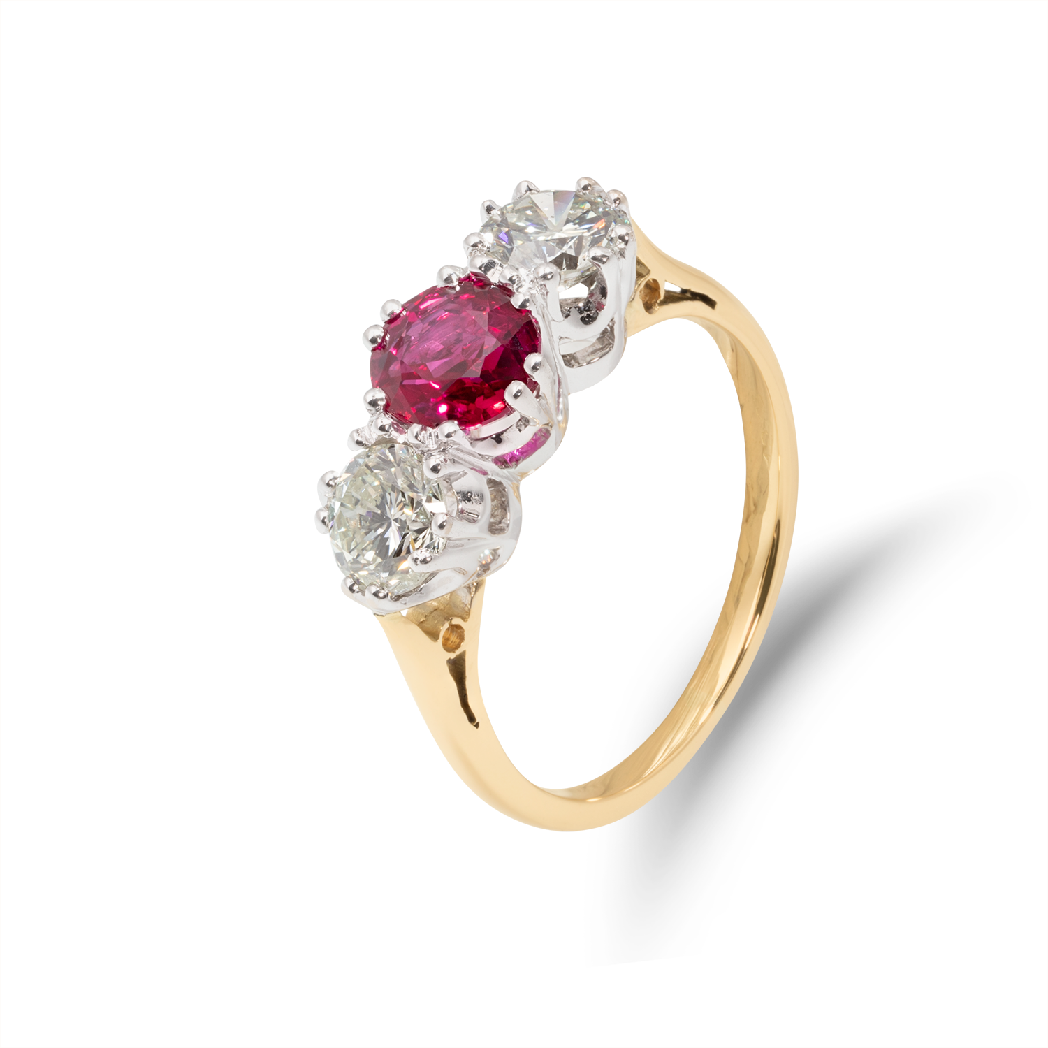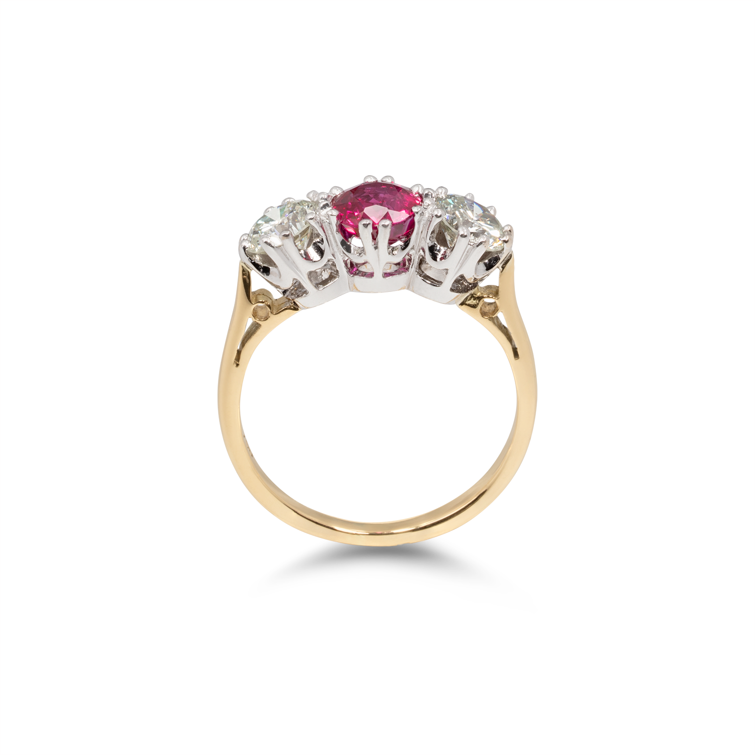 In 18K (750) yellow gold and white gold, elegant women’s ring with 3 stones, center set with a fine-quality oval-cut Burma ruby weighing 1.06 carats, unheated, shoulders set with 2 round brilliant diamonds weighing a total of 0.9 carats, H-I si, handmade