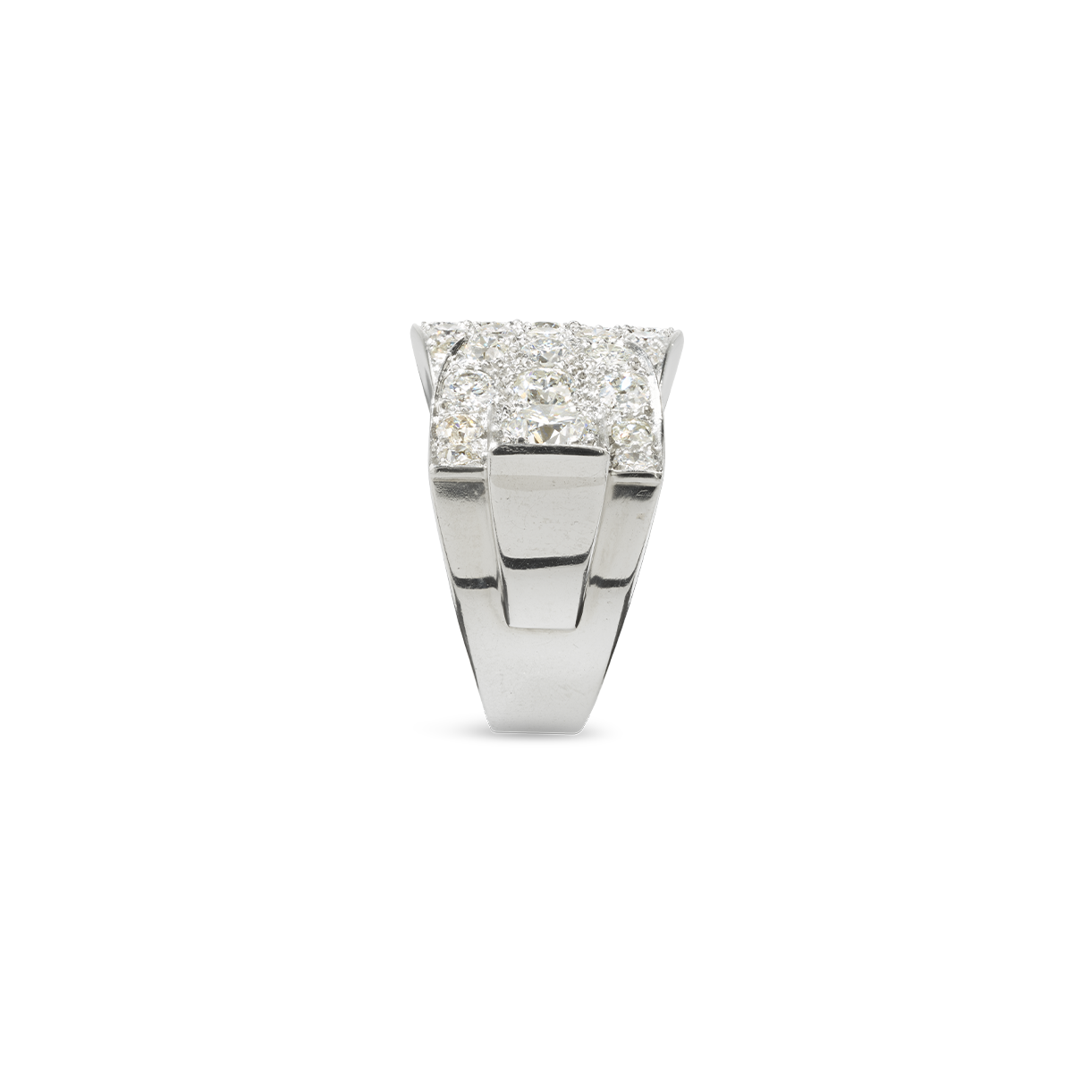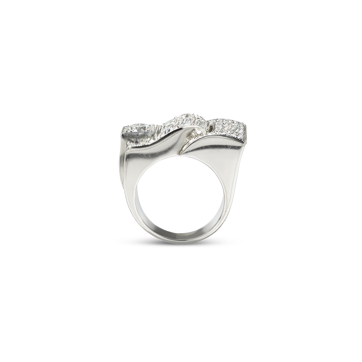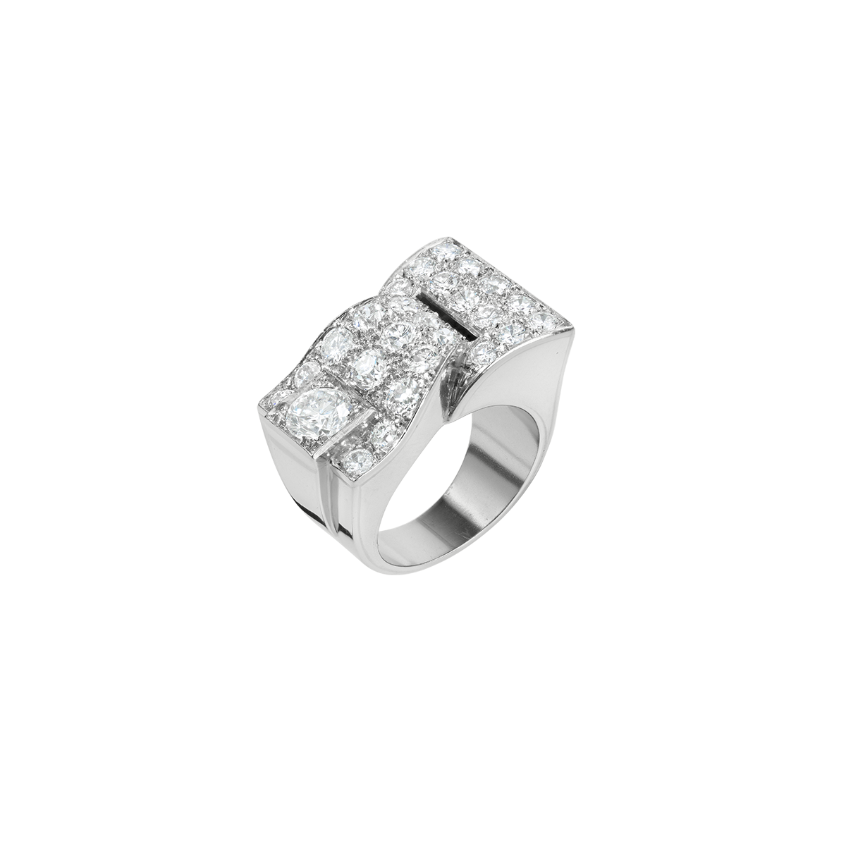 Daring, decorative ring in platinum (approx. 930) in the shape of a stylized buckle, set with a diamond weighing approximately 0.8 carats, white/si and 25 beautiful old-cut diamonds totalling approximately 2.1 carats, polished surface, very fine craftsmanship, likely a unique piece