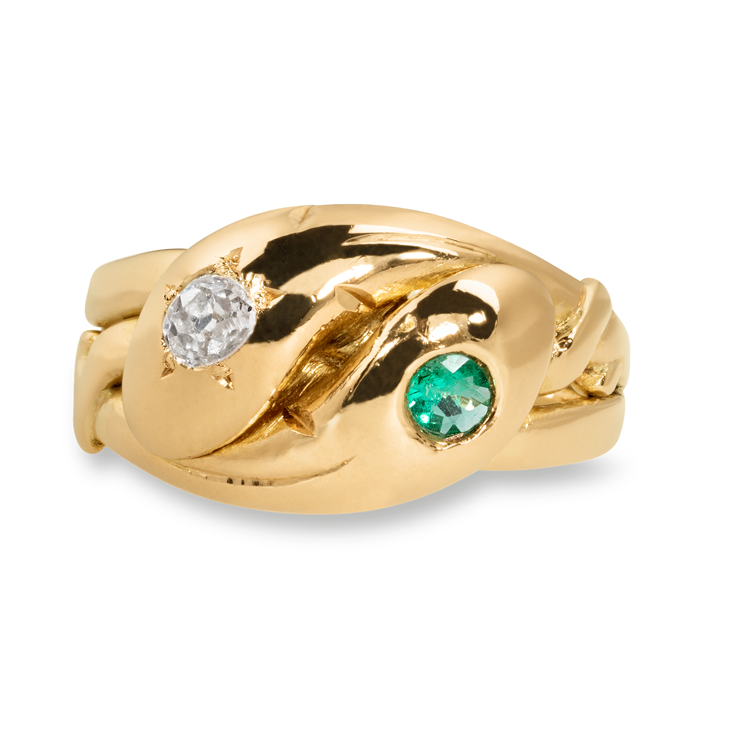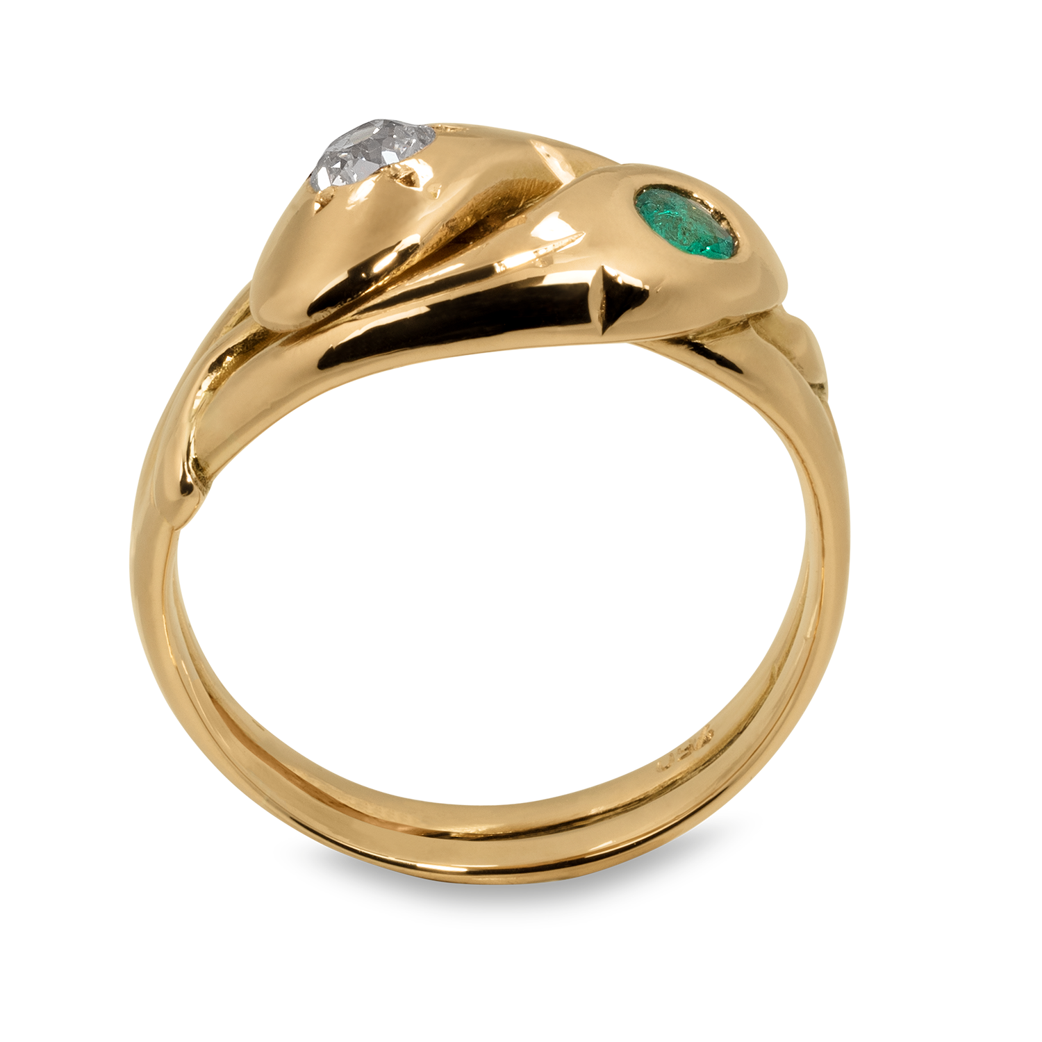 Casual, decorative women’s ring in 18K yellow gold, snake motif, set with an intense green emerald with a diameter of 0.27 mm, weighing approximately 0.06 carats, and an old-cut diamond weighing circa 0.10 carats, crystal s, handmade