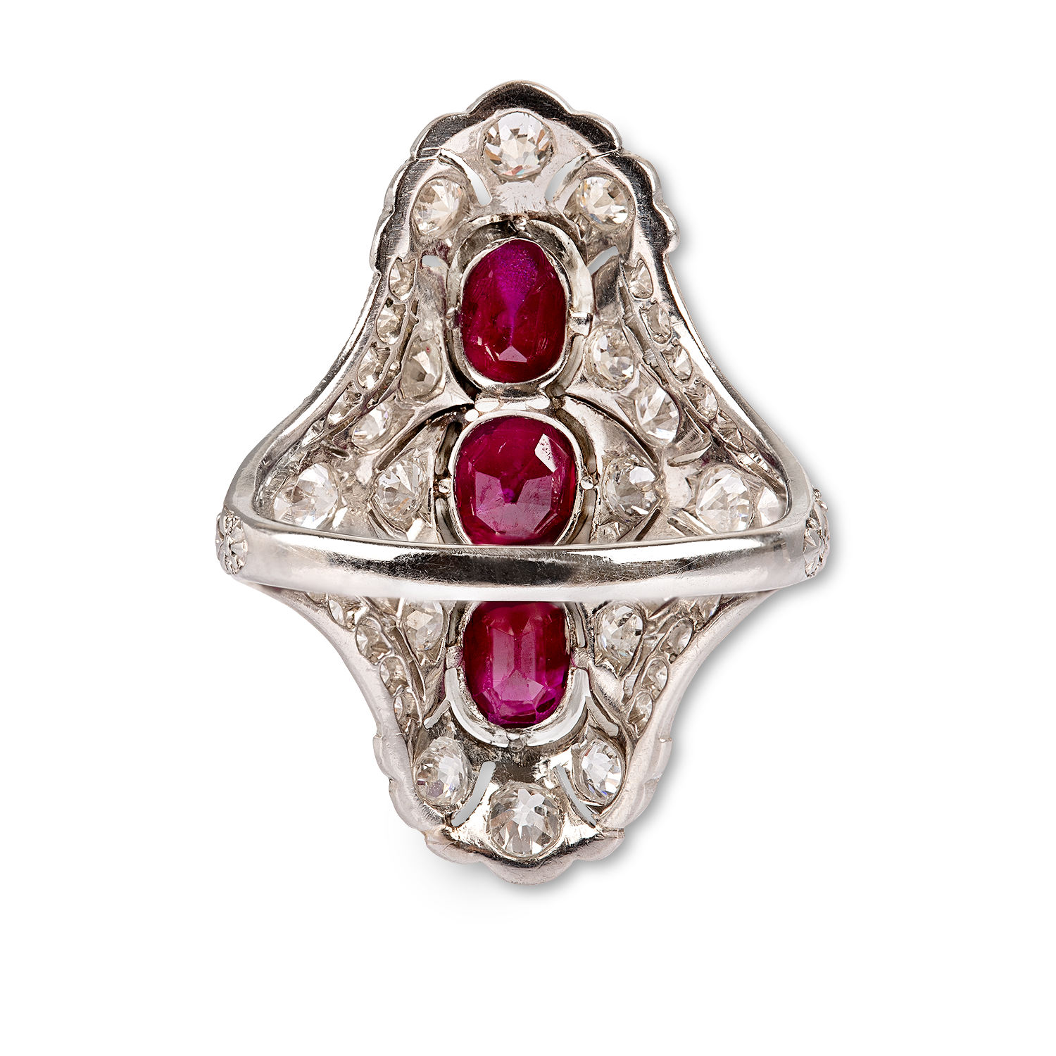 In (950) platinum, set with an oval ruby and two cushion-cut rubies, weighing a total of circa a.1.5 carats, vivid red (GRS type "pigeon's blood"), Burma (Mogok, Myanmar), no indication of thermal treatment, set with 54 old-cut and rose-cut diamonds, handmade
