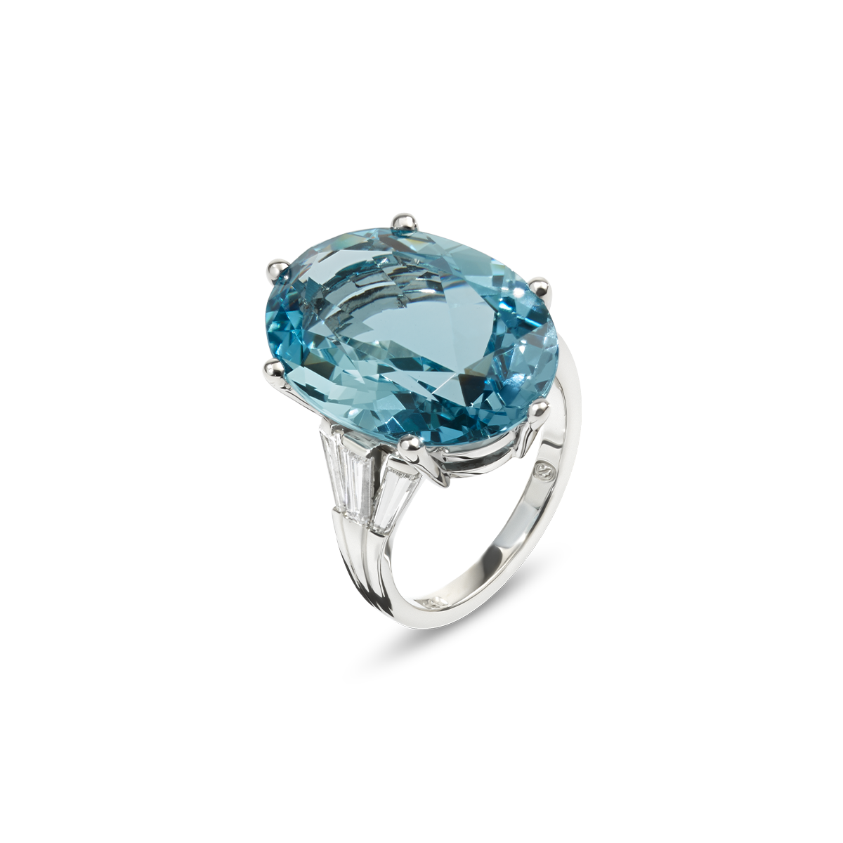 Elegant, fine aquamarine ring in 18K (750) white gold, center set with an oval aquamarine weighing 12.65 carats, 19.99 x 13.83 x 8.12 mm, Natural Beryl, GRS-type "Santa Maria" (color), flanked by 6 beautiful diamond trapezoids weighing a total of approximately 0.6 carats, top wesselton / vs-si, very fine craftsmanship
