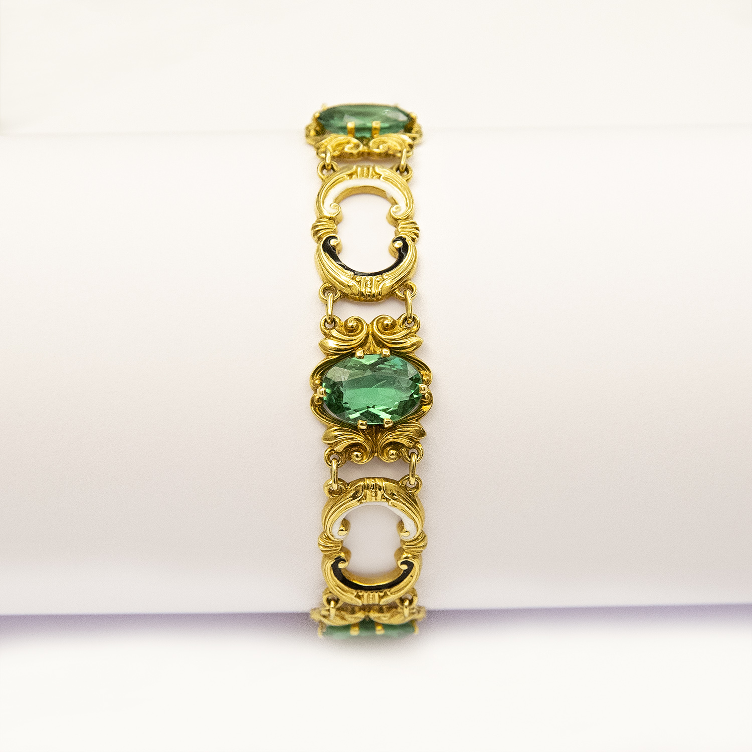 In 18K (750) yellow gold, Switzerland, with black/white enamel, set with 4 very beautiful oval tourmalines weighing a total of circa 7.8 carats, hollow manufacturing, mounted safety chain, handmade