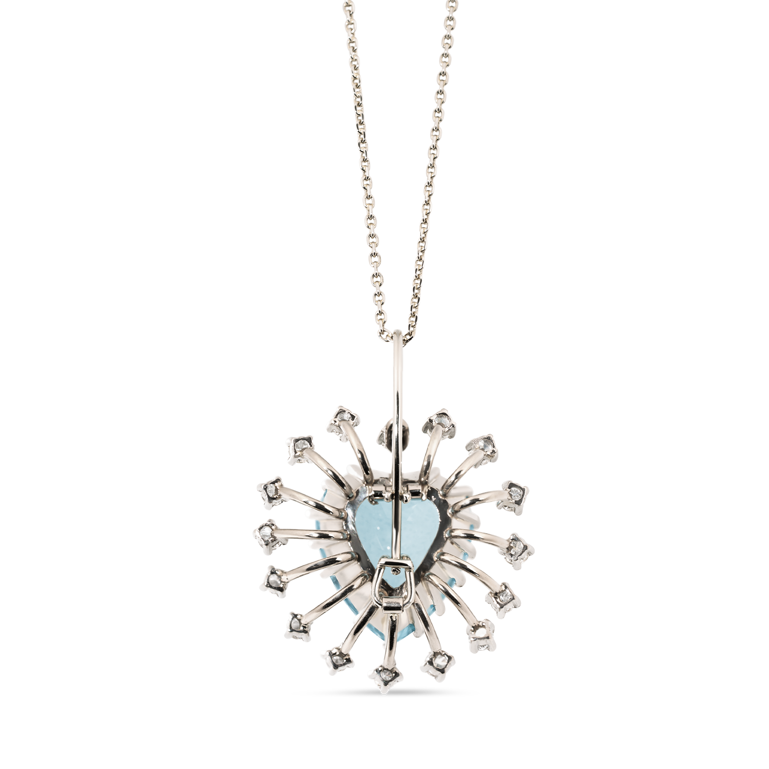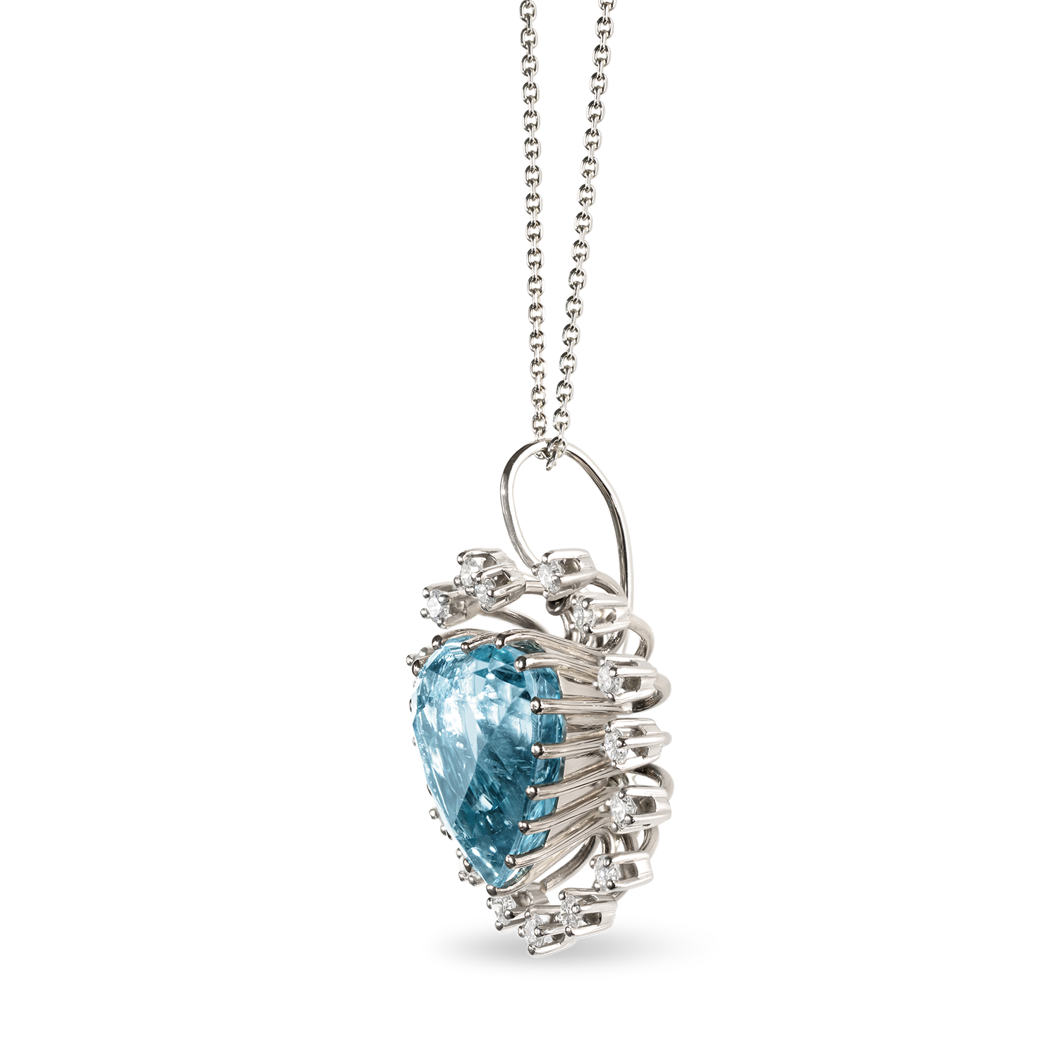 Charming pendant in 18K (750) white gold, center set with a heart-cut aquamarine weighing circa 10 carats, 13.5 x 13.3 mm, mid-range colour, small inclusions, surrounded by a delicate entourage of 16 round brilliant diamonds weighing a total of circa 0.6 carats, wesselton/vs, circa 2.1 mm in diameter, in 4-prong settings, pendant loop with clasp (safety latch), fine craftsmanship