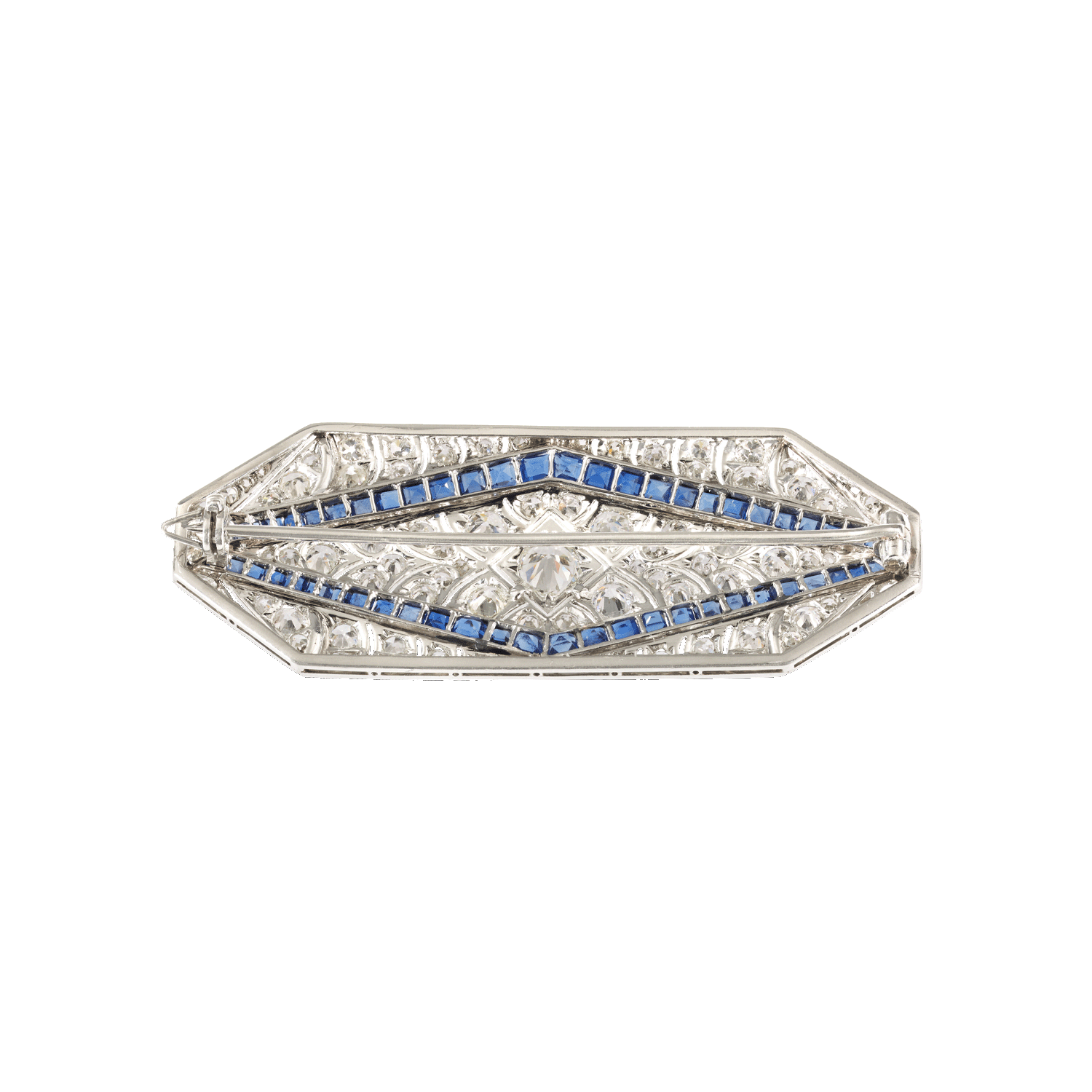 In Platin, besetzt mit schönen Altschliff Diamanten, total 2.25 ct., im Zentrum 1 Brillant ca. 0.65 ct., wesselton, vs, zwei Linien bestehend aus total 53 Saphir-Carrés, feine Farbe, total ca. 3 ct., sehr schöne Handarbeit