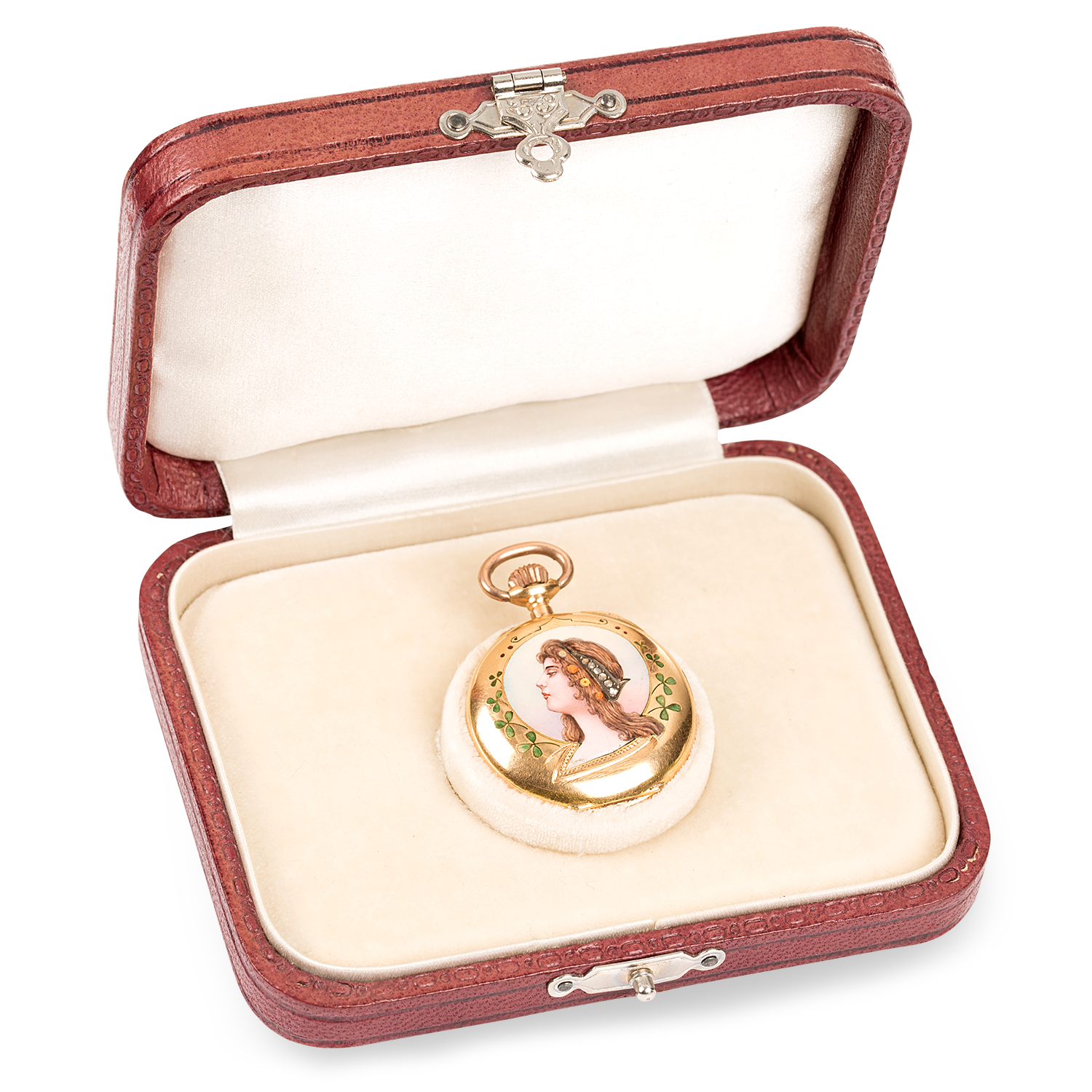In Gelbgold 18K (750), Schweizer Uhrwerk, revidiert, Email-Mädchenkopf mit Diadem, besetzt mit einer Perle und 6 Diamant-Rosen, Bügel vergoldet, handgefertigt