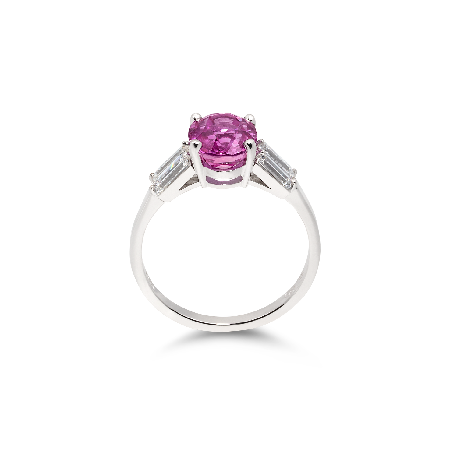 Beautiful, classic diamond ring in 18K white gold set with an oval-shaped pink Burma sapphire weighing around 2.40 carats, untreated, 7.84 x 6.84 x 4.90 mm, with a baguette-cut diamond on each side, weighing a total of circa 0.60 carats., handmade