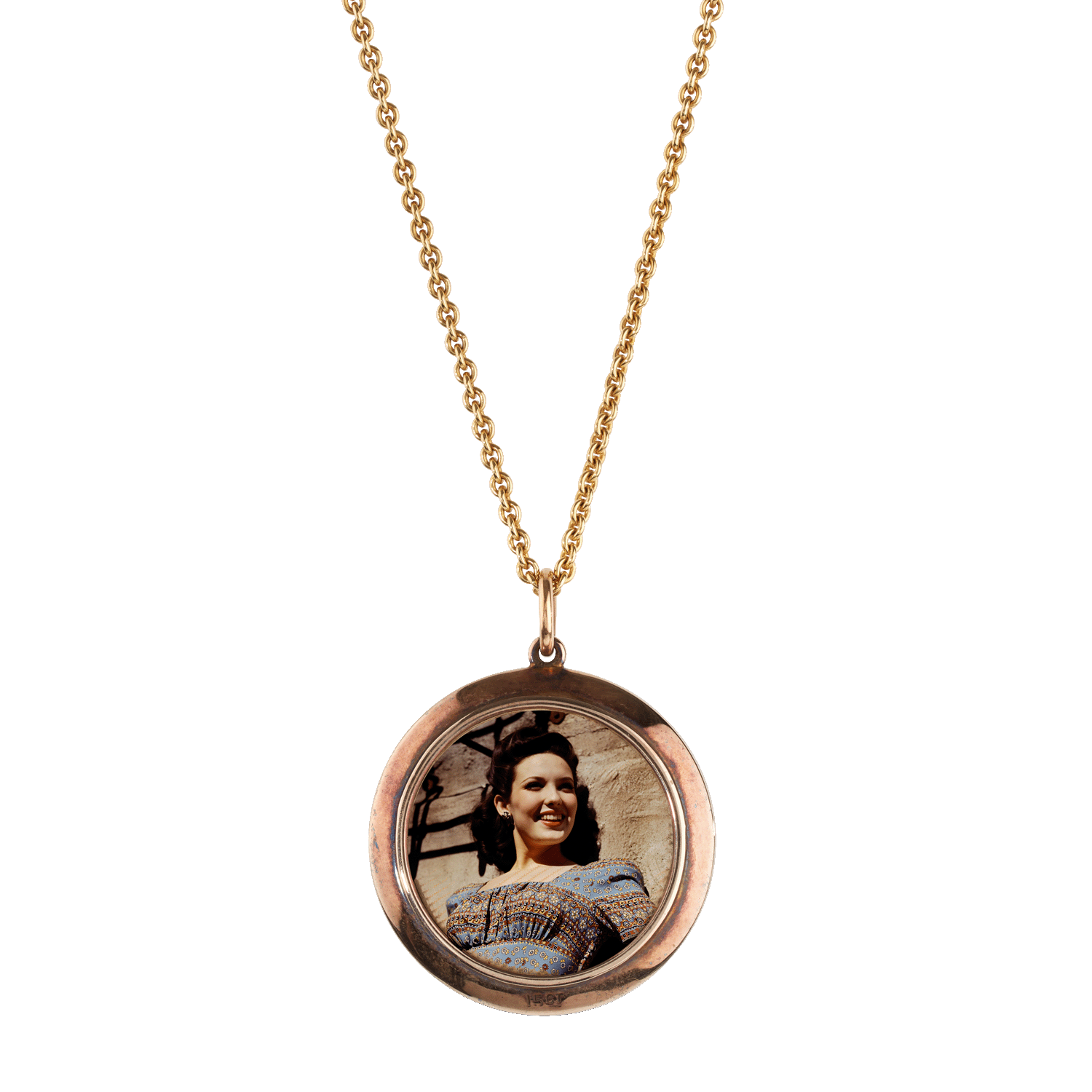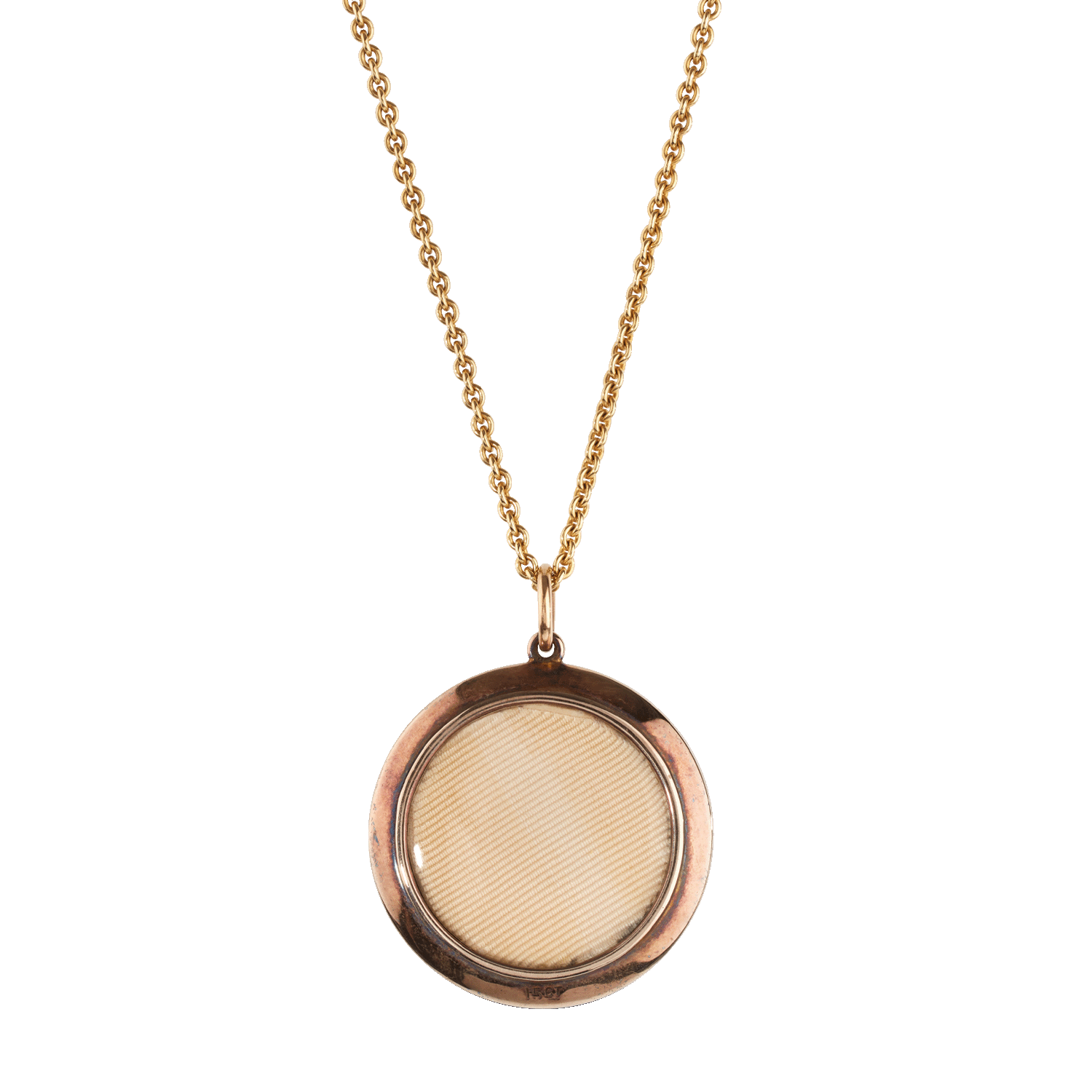 Elegant and beautiful locket in 15K (625) yellow gold and rose gold, enamel on a guilloche surface, set with a natural pearl, handmade