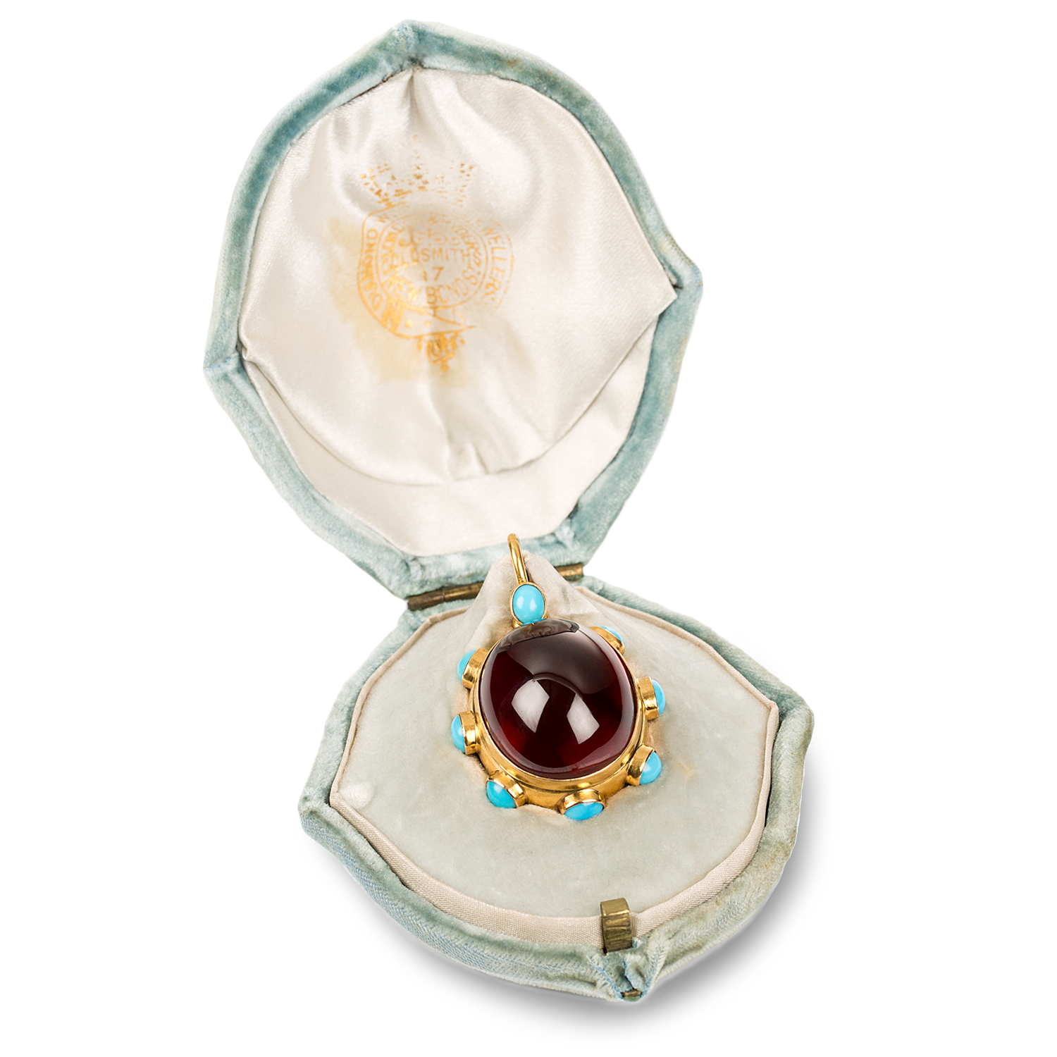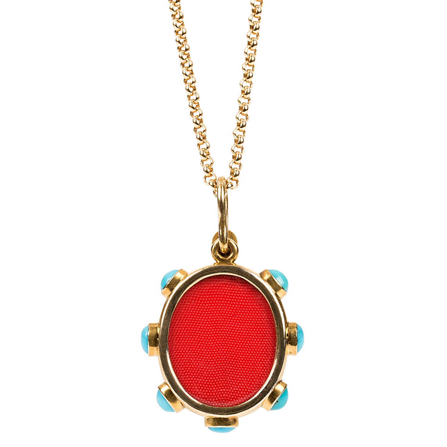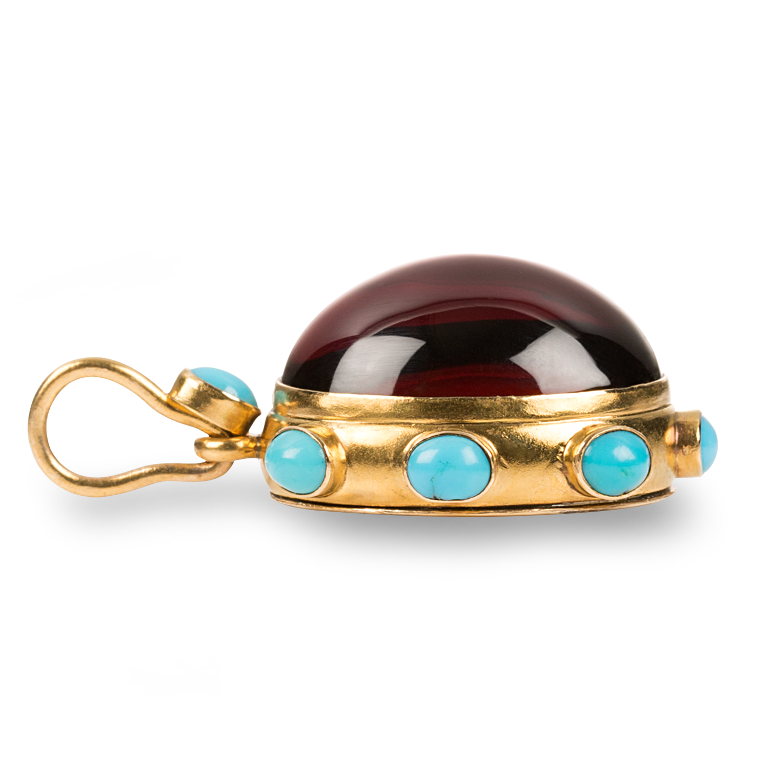In yellow gold, oval design, set with a foil-backed garnet cabochon, carat weight circa 30, frame decorated with 7 oval turquoise cabochons of approximately 3.5 x 4.4 mm, Glass insert for image on the back, handmade