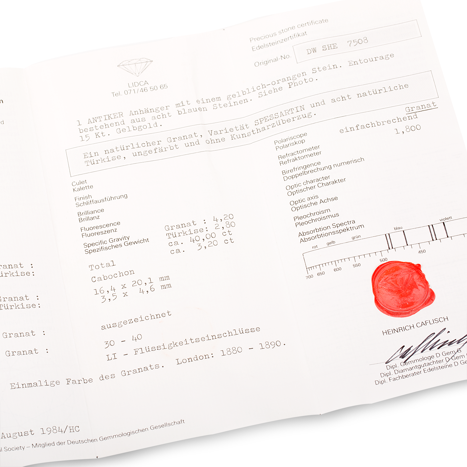 Accompanied by a Lohri certificate, a gemstone certificate for the garnet cabochon and the original box