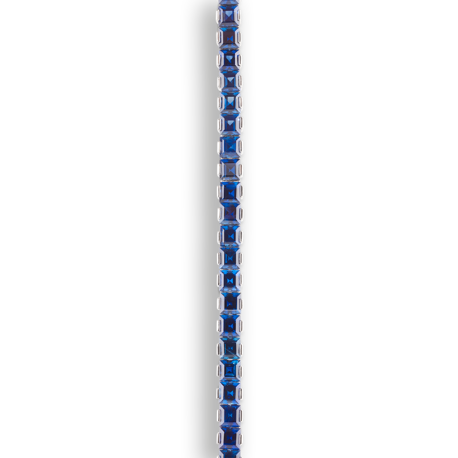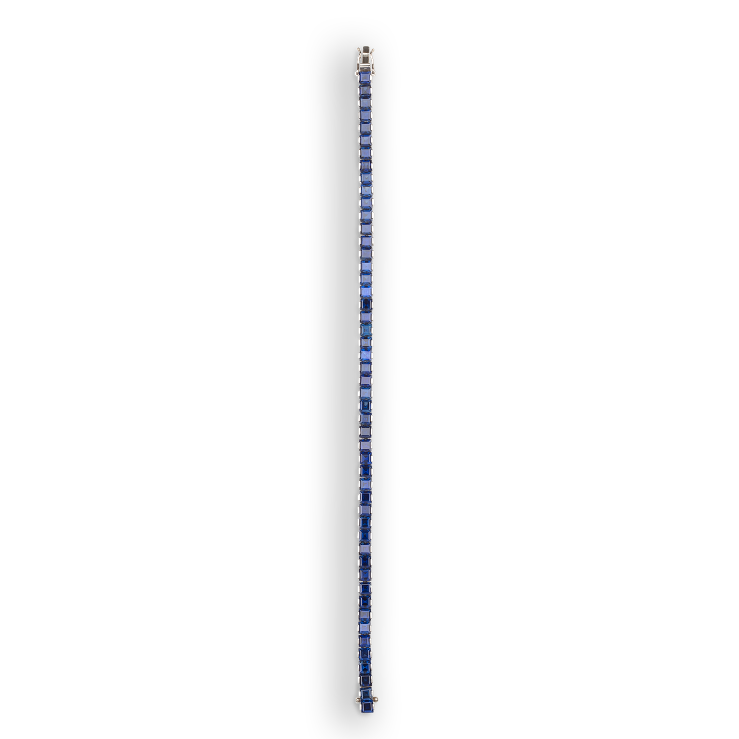 In platinum (950), high-end, classic, casual rivière bracelet, set with 50 carré-cut sapphires weighing a total of 14 carats, vivid blue, no heat, no indication of thermal treatment, the flexible movement and detailed work showcase fine craftsmanship, polished finish, box clasp, handmade.