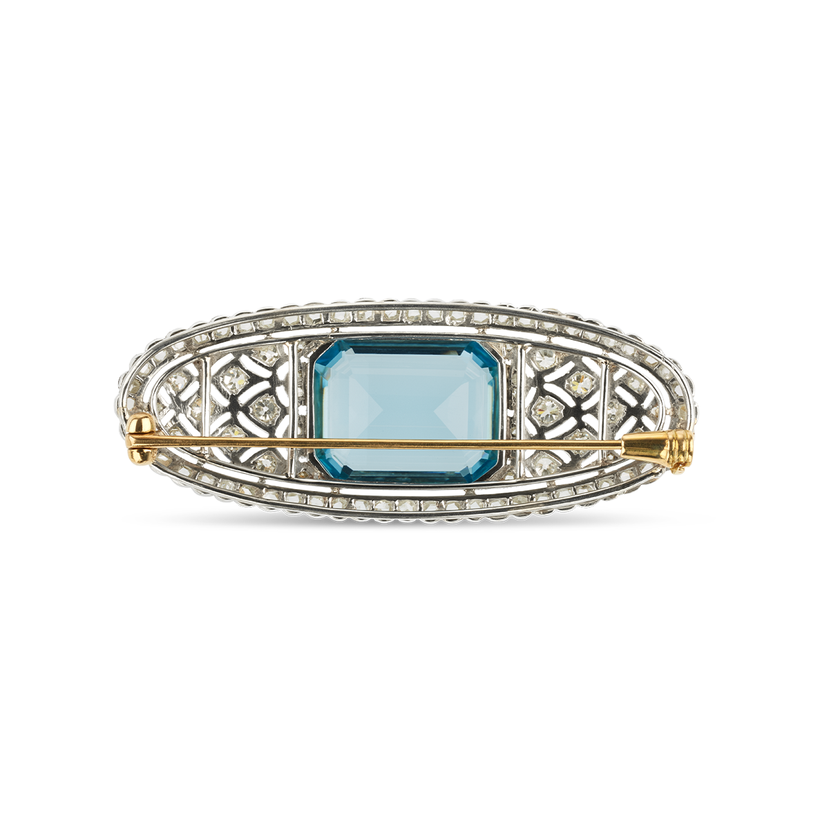 Decorative, intricately worked brooch in 950 platinum and 18K (750) yellow gold, center set with a beautiful octagonal aquamarine weighing approximately 9.19 carats, 15.6 x 12.2 x 6.3mm, natural beryl, pastel blue, surrounded by numerous old-cut and rose-cut diamonds, border adorned with rose-cut diamonds, brooch pin in yellow gold, very fine, high-quality craftsmanship