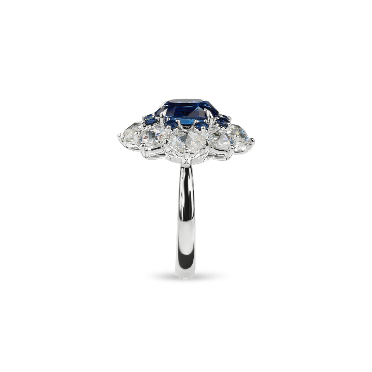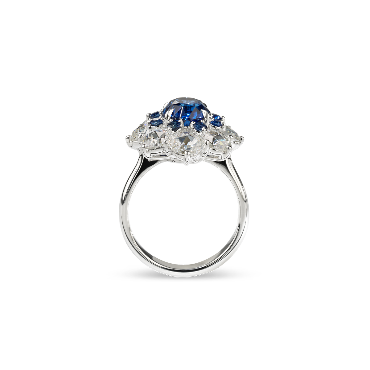 Attractive sapphire ring in 18K (750), center set with an oval sapphire weighing 3.16 carats, 9.6 x 7.14 x 5.44 mm, blue, likely from Madagascar, no heat, surrounded by an entourage of 8 rose-cut diamonds weighing a total of 2.46 carats and 8 round-cut blue sapphires weighing a total of 0.35 carats, very fine jewellery craftsmanship