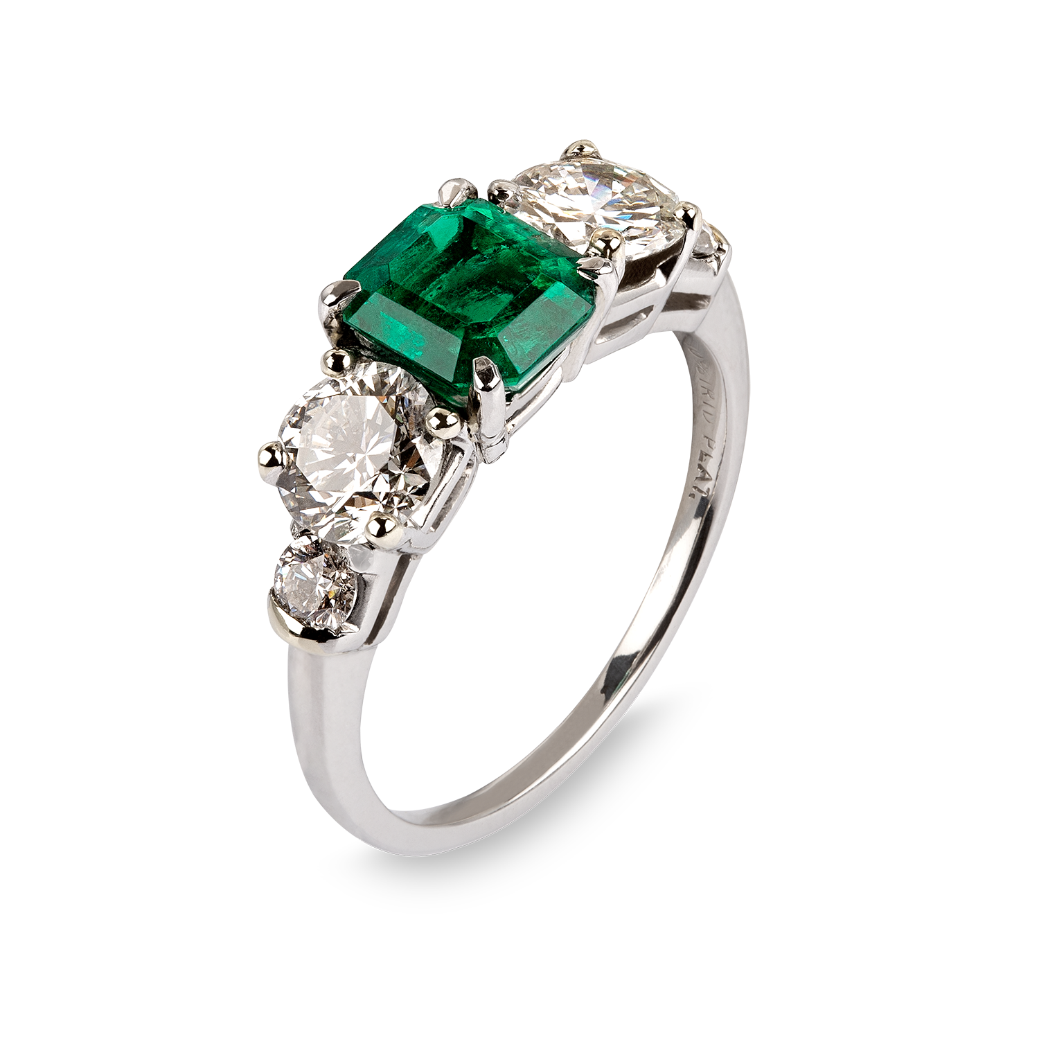 Elegant, fine emerald and diamond ring in platinum 900/1000 und 10% iridium, centre set with an octagonal Colombian emerald weighing circa 1.25 carats, minor oil, 2 brilliant-cut diamonds on each side weighing circa 0.55 carats, 2 smaller diamonds weighing a total of circa 0.2 carats G vs2-si1, total diamond weight circa 1.3 carats, polished finish, handmade