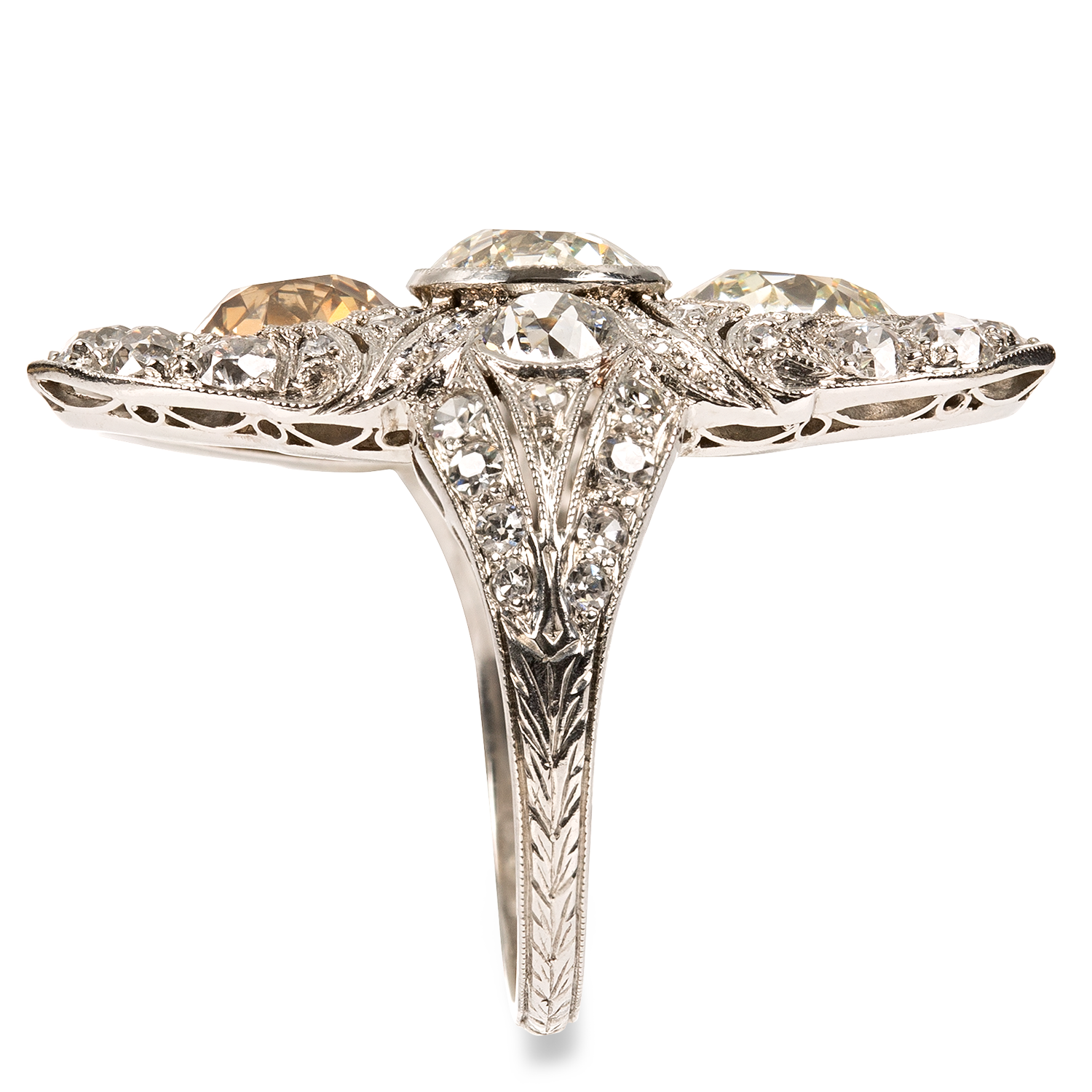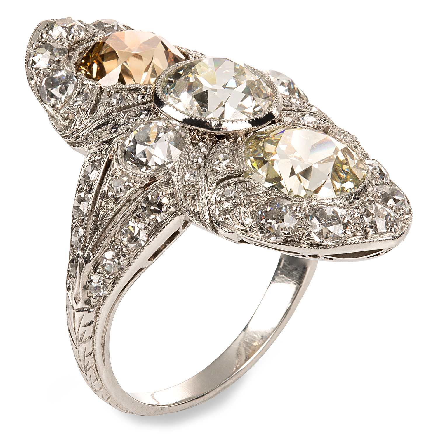 In 950 platinum, fine elegant women’s ring in the shape of a navette, dating from around 1920, center set with 3 beautiful old-cut diamonds, of which one is orange-brown (natural-coloured) and 2 are K-M / vsi, each weighing circa 1 carat, framed with 56 smaller old-cut diamonds, total diamond weight circa 4 carats, ring band embellished with decorative hand engravings, handmade