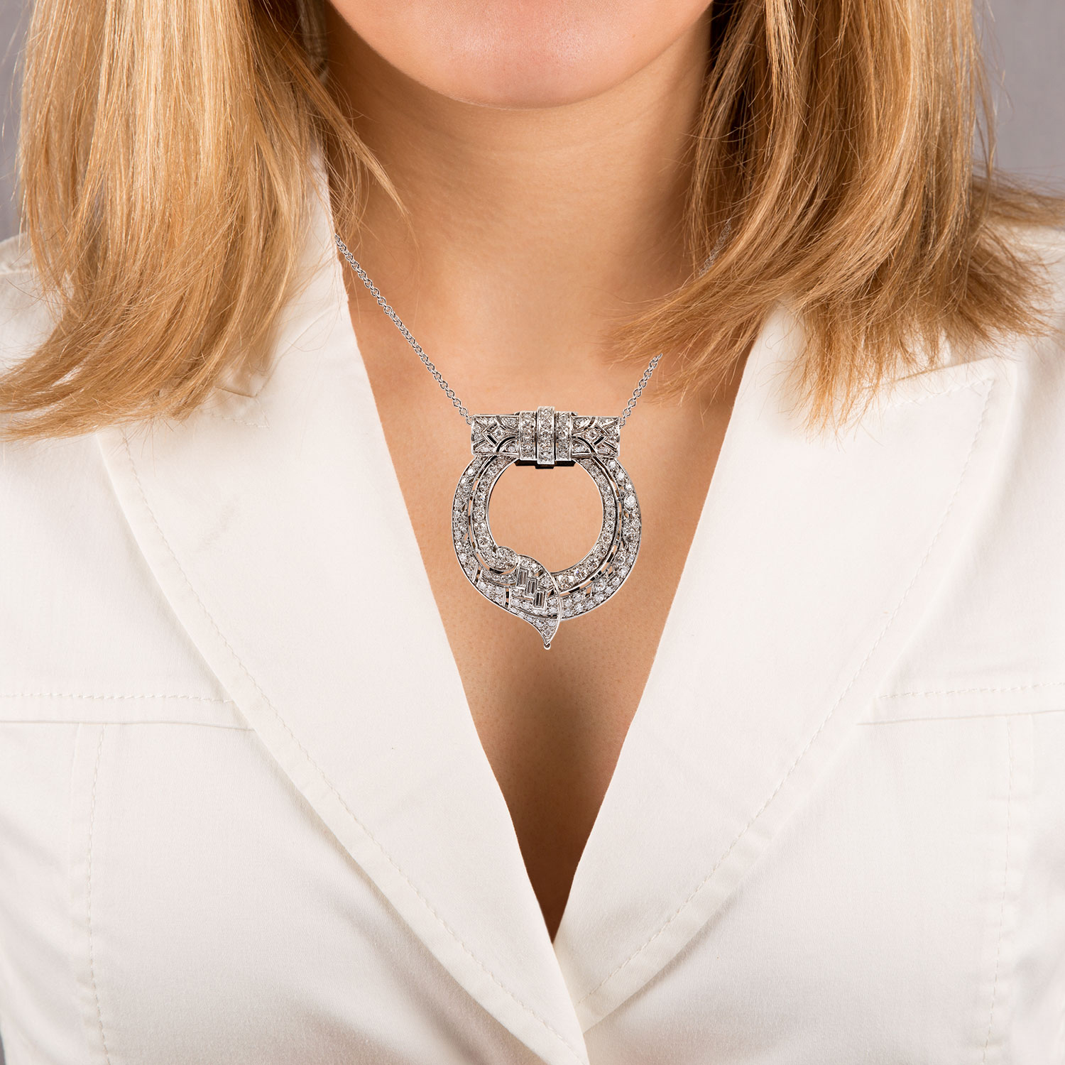 Fast-paced industrialization and new developments pave the way for the transition into modern society, bringing forth the modern woman. She now appears and behaves like the American movie stars – smoking, dancing and listening to jazz. Her hair is short and she is active and boyish. Jewellery from this period suits this image with its geometric, austere and distinct design. Inlays of precious stone, diamonds and enamel yield distinctive pieces of jewellery with stark one colour contrasts. Innovations, such as the invisible setting from Van Cleef & Arpels, also pave the way for unprecedented jewels.