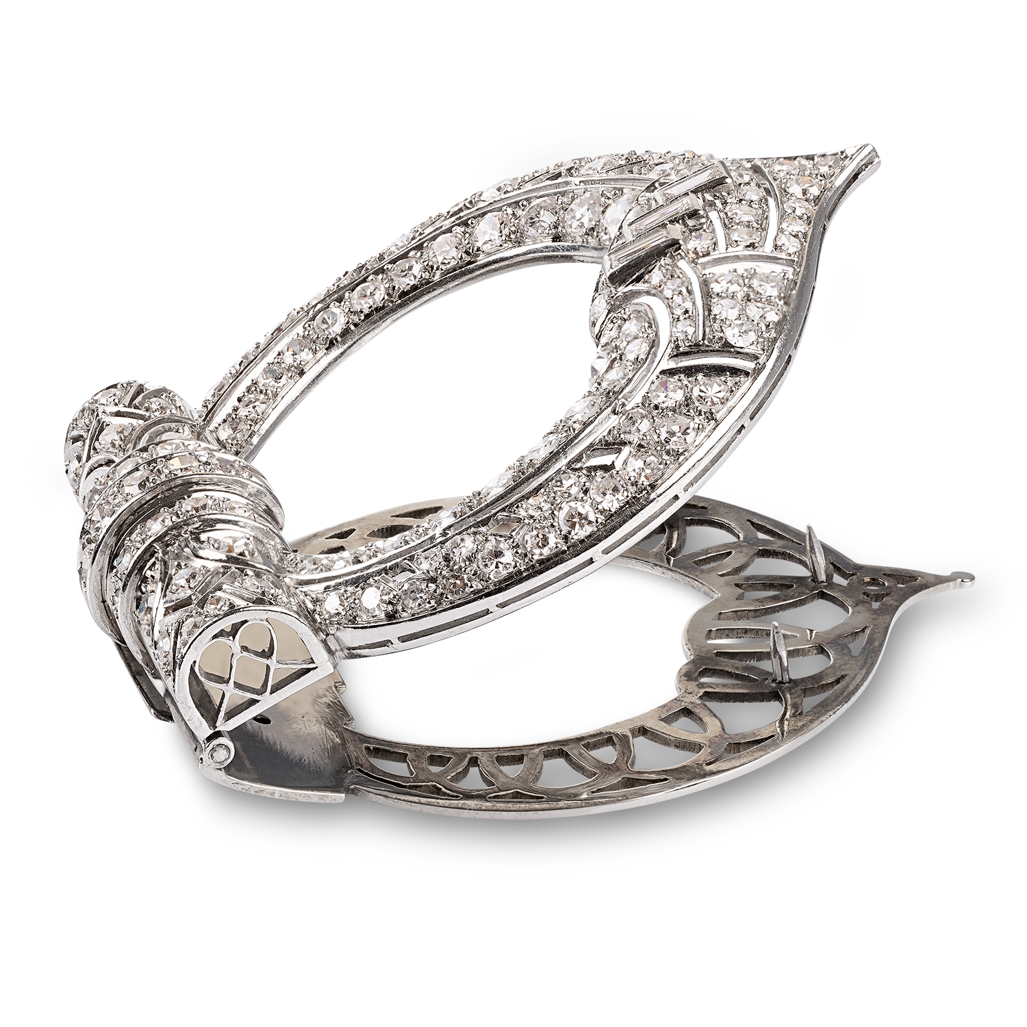 In platinum (950) clip-on system in circa 18K white gold, set with round brilliant diamonds 1.5-3.3 mm and 3 diamond baguettes weighing a total of circa 2.7-3.0 carats, G-I/vs-si, with a special delicate engraving (in floral design) on the back, handmade