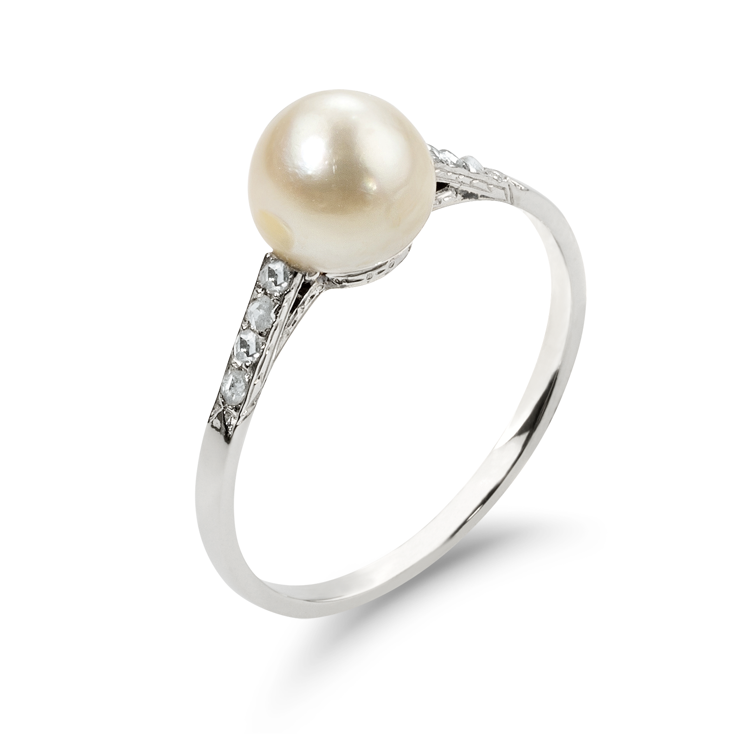 charming, fine, elegant pearl ring in platinum, set with a creamy-white natural pearl, button-shaped, circa 7 mm, GGTL report no. 20-B-5327, shoulders embellished with 4 grain-set rose-cut diamonds, handmade