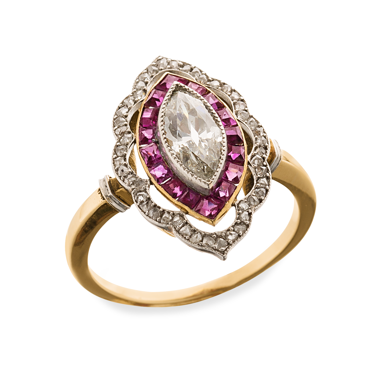 In 18K yellow gold and 950 platinum, set with a diamond navette weighing circa 0.8 – 0.9 carats, surrounded by an entourage of 16 rubies and an outer entourage of 46 rose-cut diamonds, handmade
