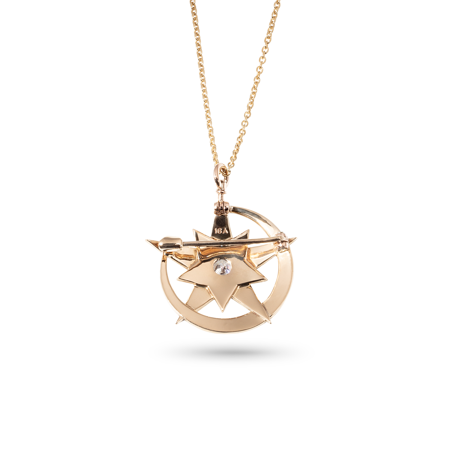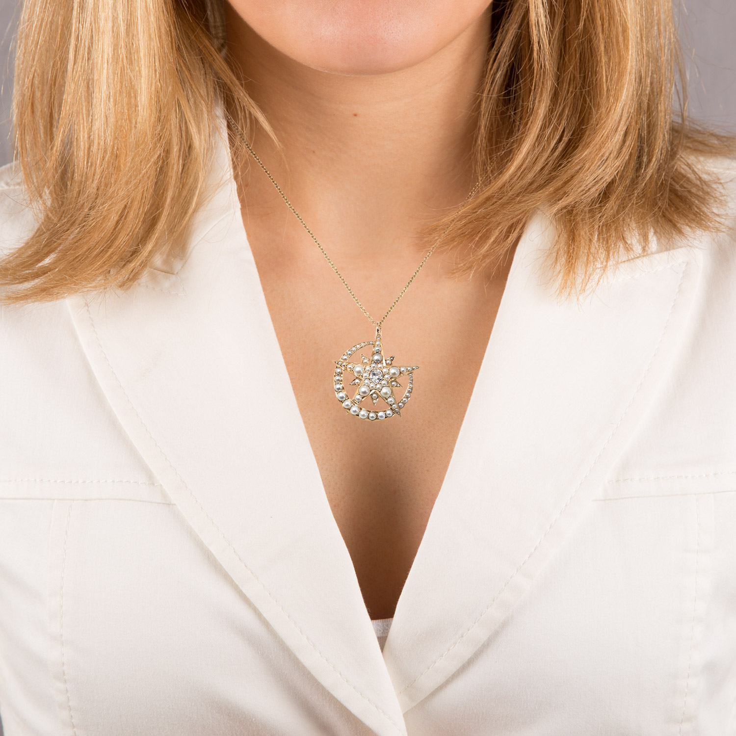 In 15-18K (585-750) yellow gold, England, dating from the late Victorian era with star and moon design, set with natural half-pearls, center set with 1 diamond weighing circa 0.35 ct. (most likely added at a later date, with chip), foldable loop suspension, handmade