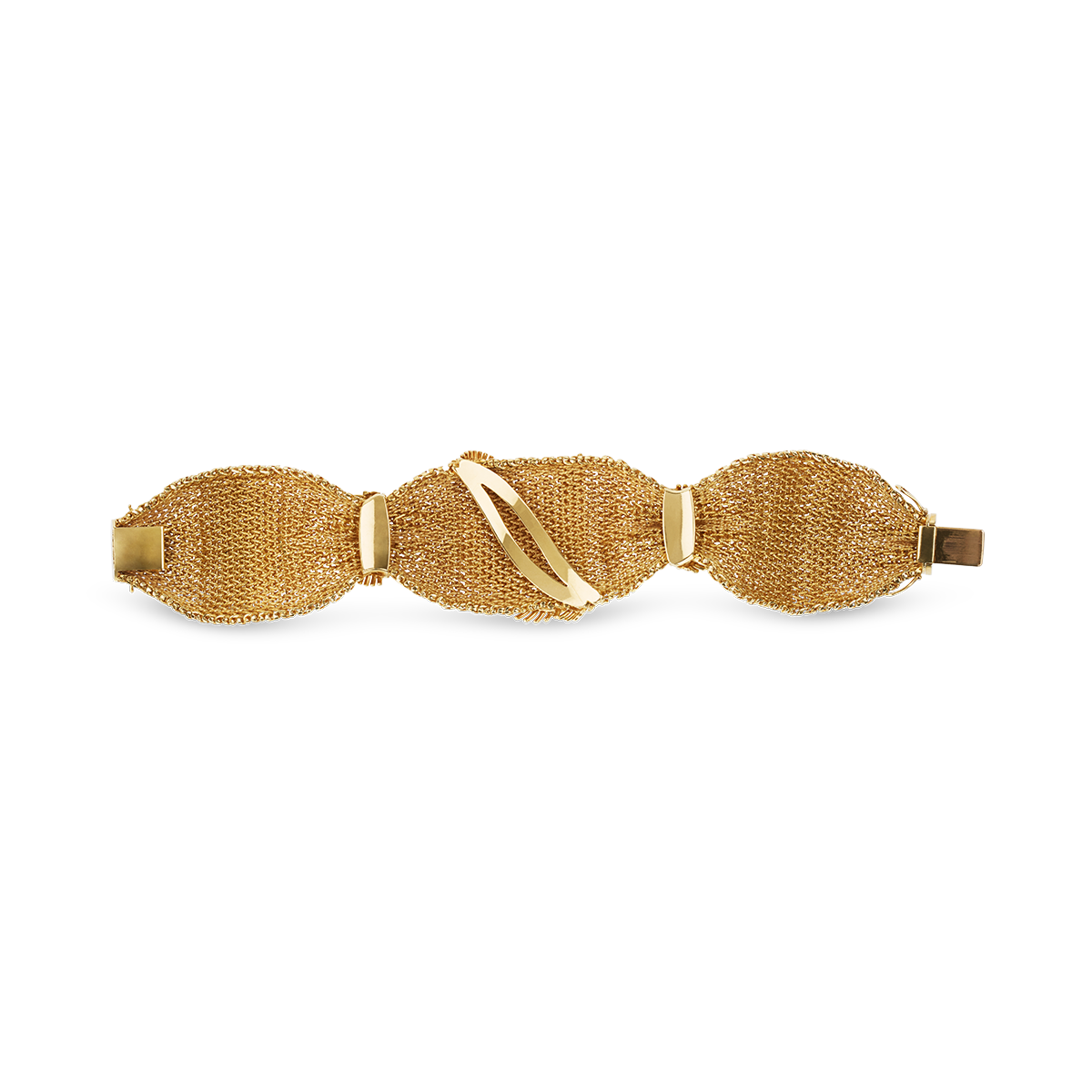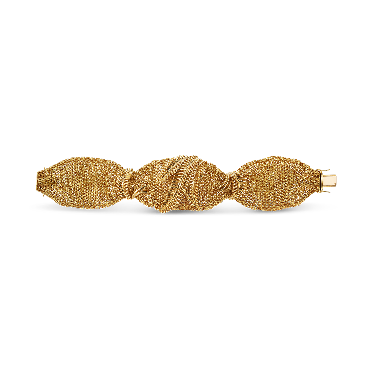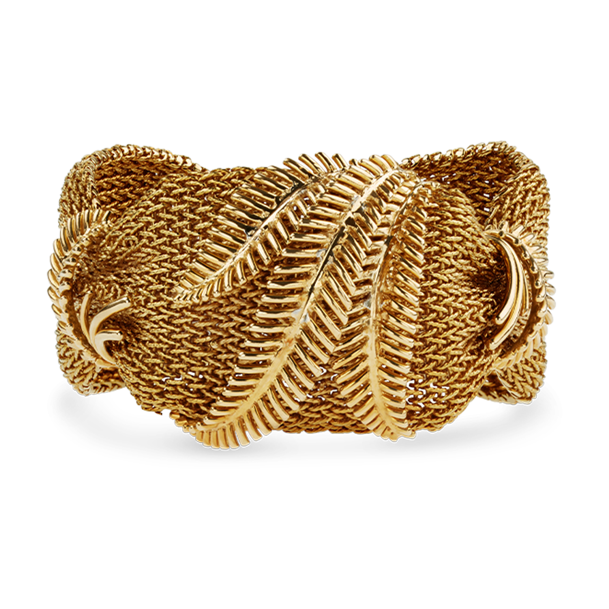 Fantastic, elegant, wide bracelet in 18K (750) yellow gold, with an intricate braided pattern, held together by applied leaf motifs, featuring an integrated box clasp with two safety clasps. Fine, high-quality craftsmanship